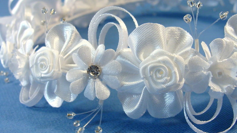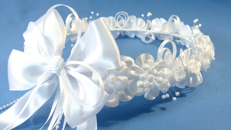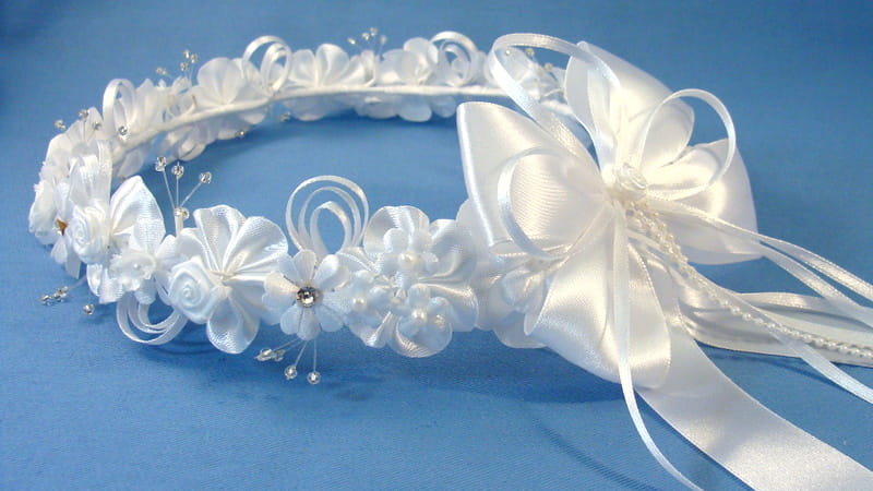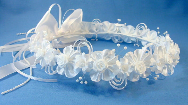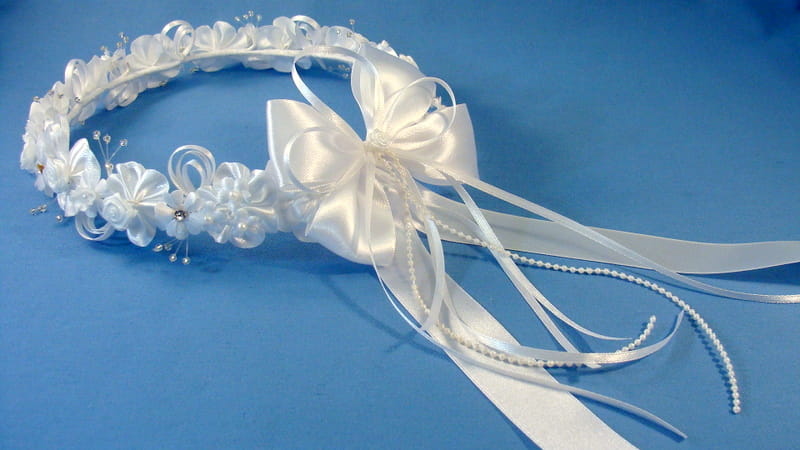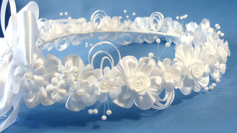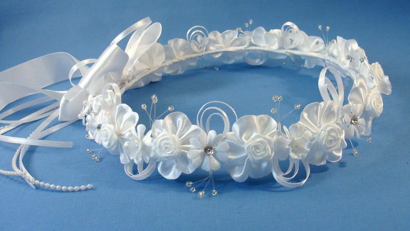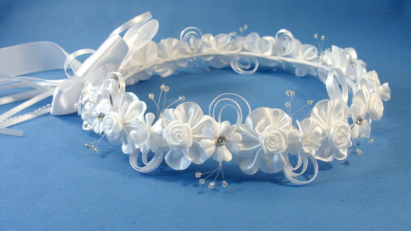 Tył wianka ozdabia biała , atłasowa kokarda , atłasowe tasiemki, perełki nanizane na sznureczek i komponująca się z całym wiankiem różyczka.