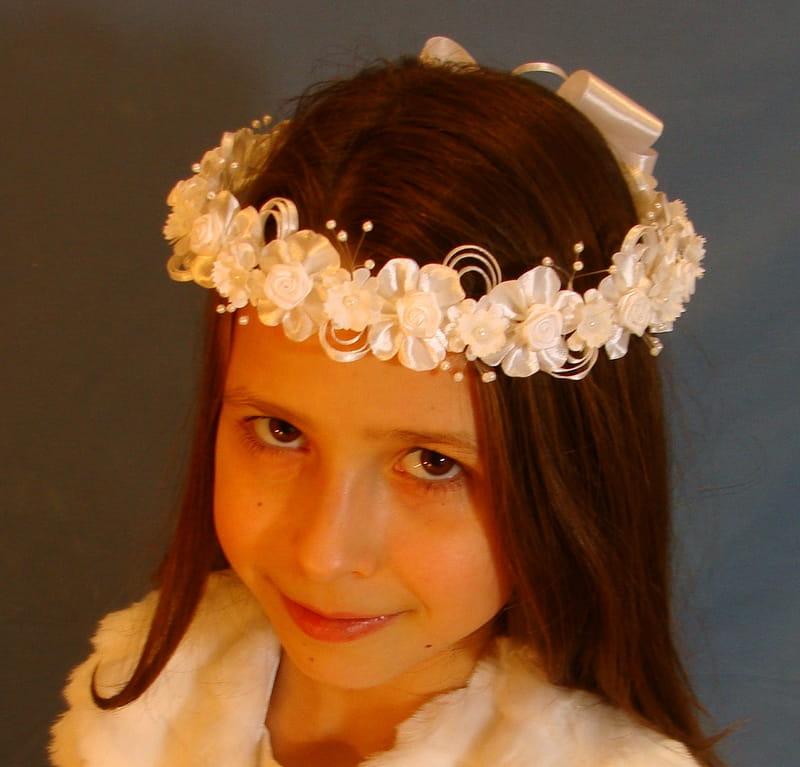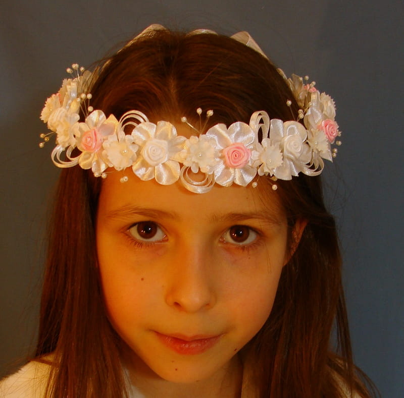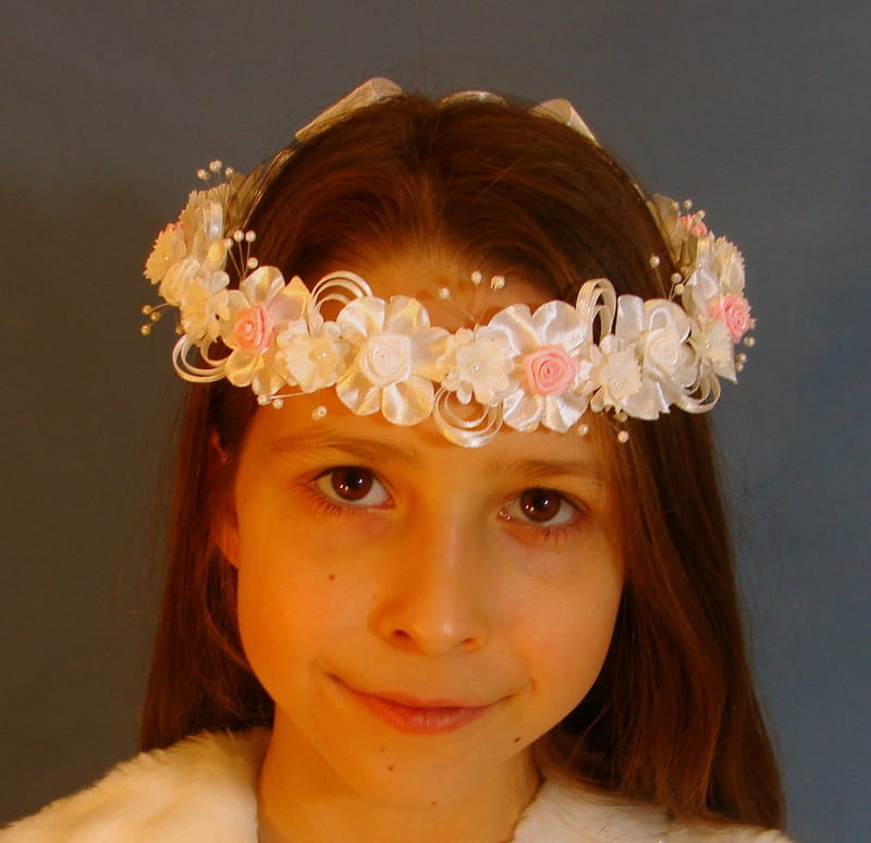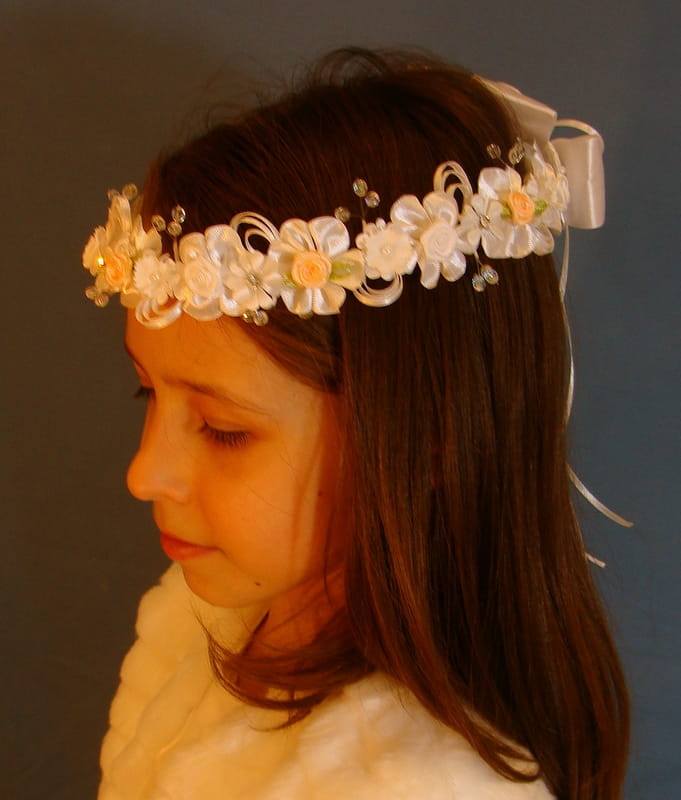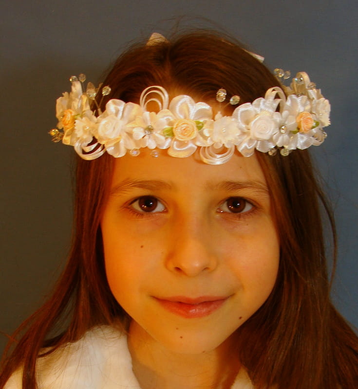 Wianek Agatka to kompozycja atłasowych elementów - różyczek, kwiatków, okółków, konwalii . Całość zdobią srebrne koraliki na żyłkach, dżety i atłasowe pawie oka .Przy wyborze tego wariantu prosimy dopisać w uwagach :SREBRNE KORALIKI
