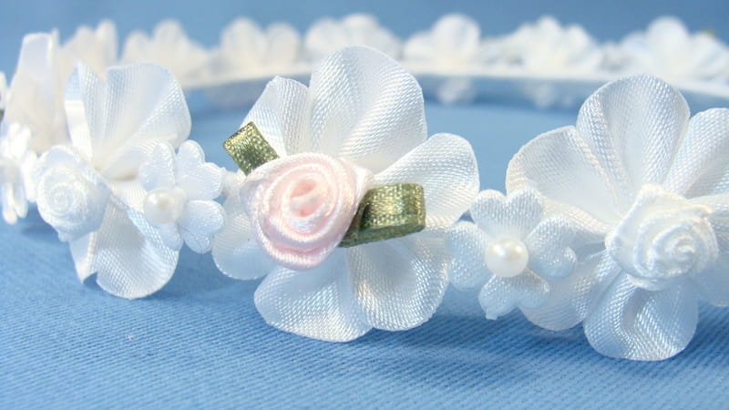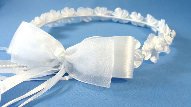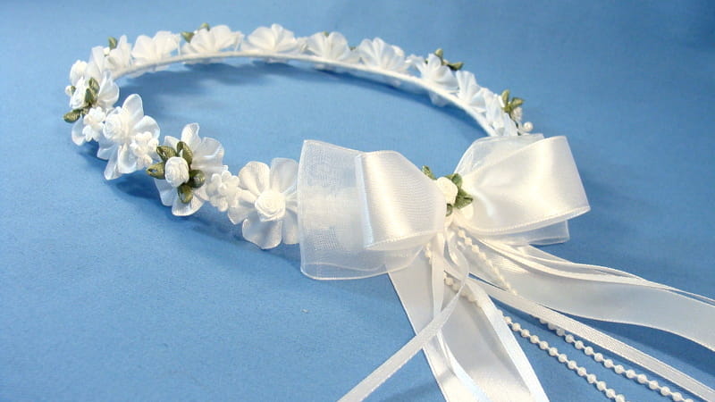 Tył wianka ozdabia biała , atłasowo-szyfonowa  kokarda , atłasowe tasiemki, perełki nanizane na sznureczek i komponująca się z całym wiankiem różyczka.