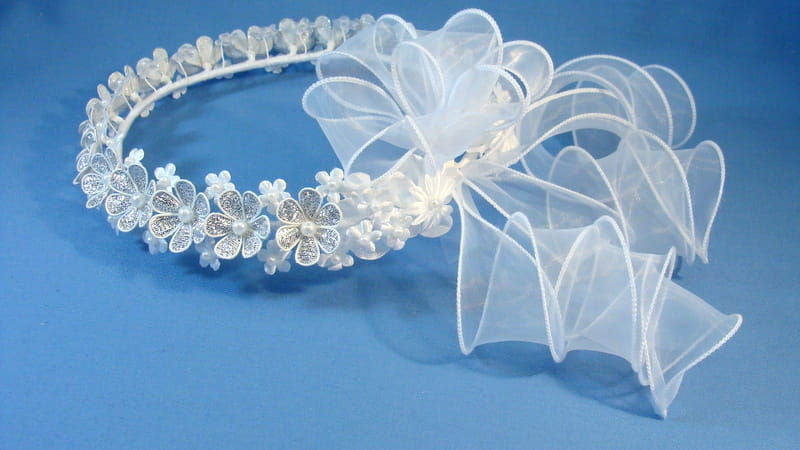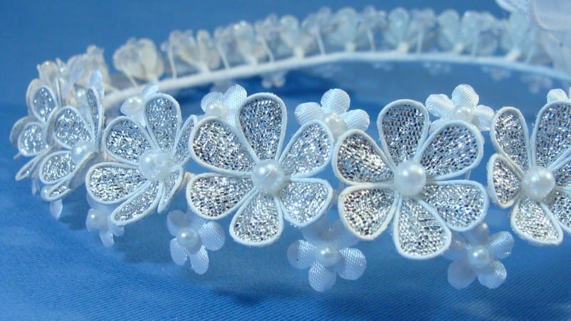 Wianek Barbie ozdobiony jest srebrnymi, ręcznie robionymi kwiatkami oraz białymi kwiatkami z perełkami.