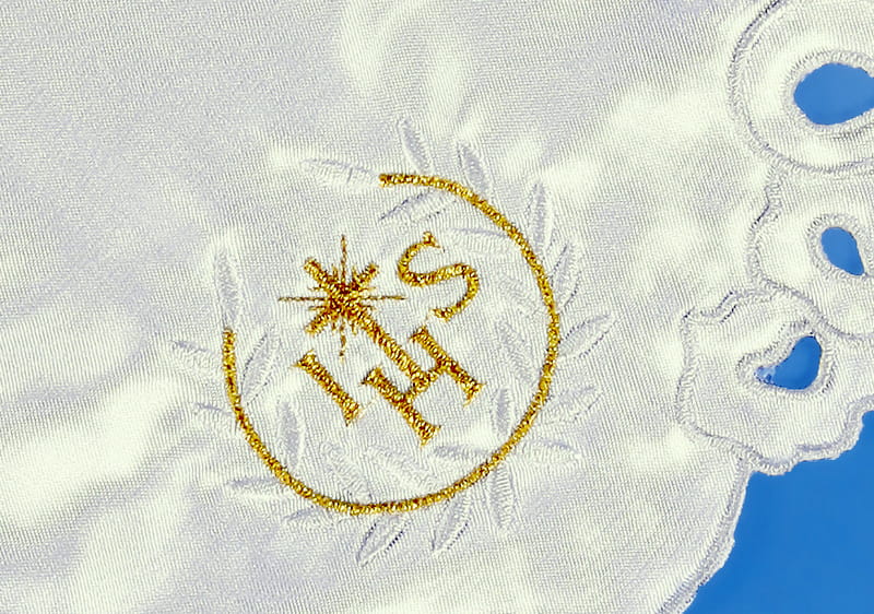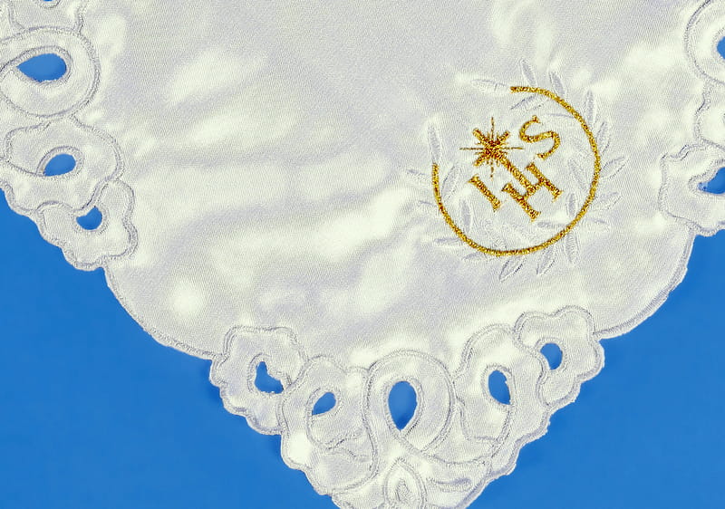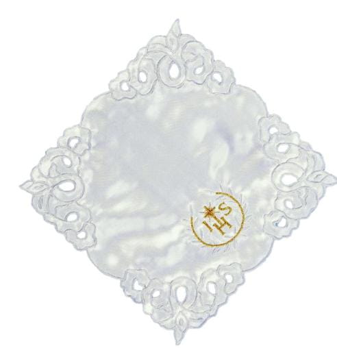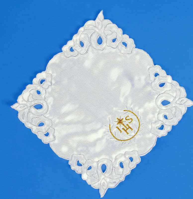 Pamiątkowa chusteczka do komunii wykonana z białej satyny, zdobionej pięknym haftem w kolorze bieli i złota. Chusteczka w kształcie kwadratu o wymiarach 21,5cm.
