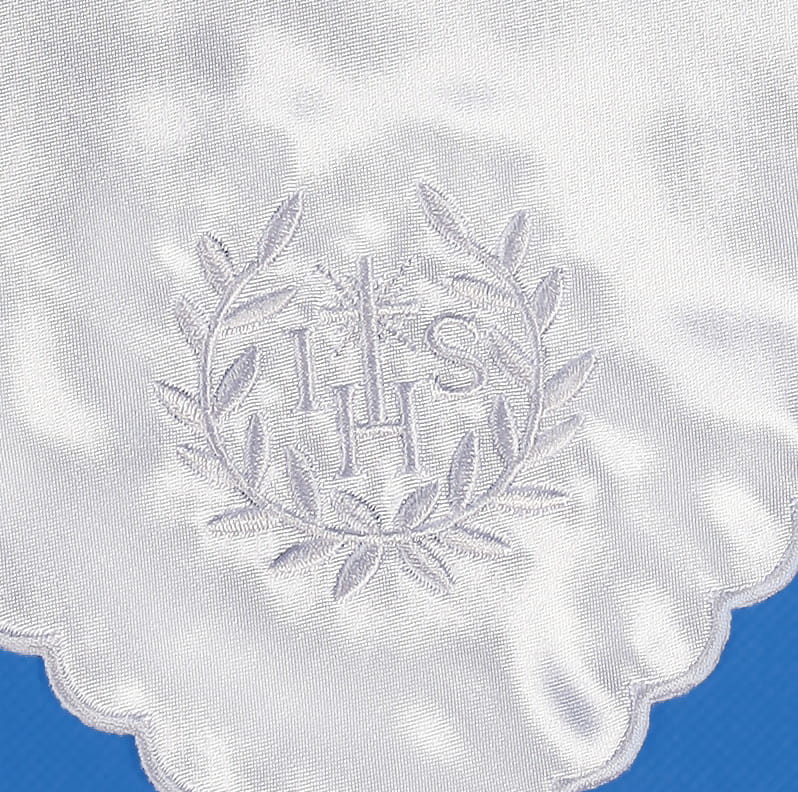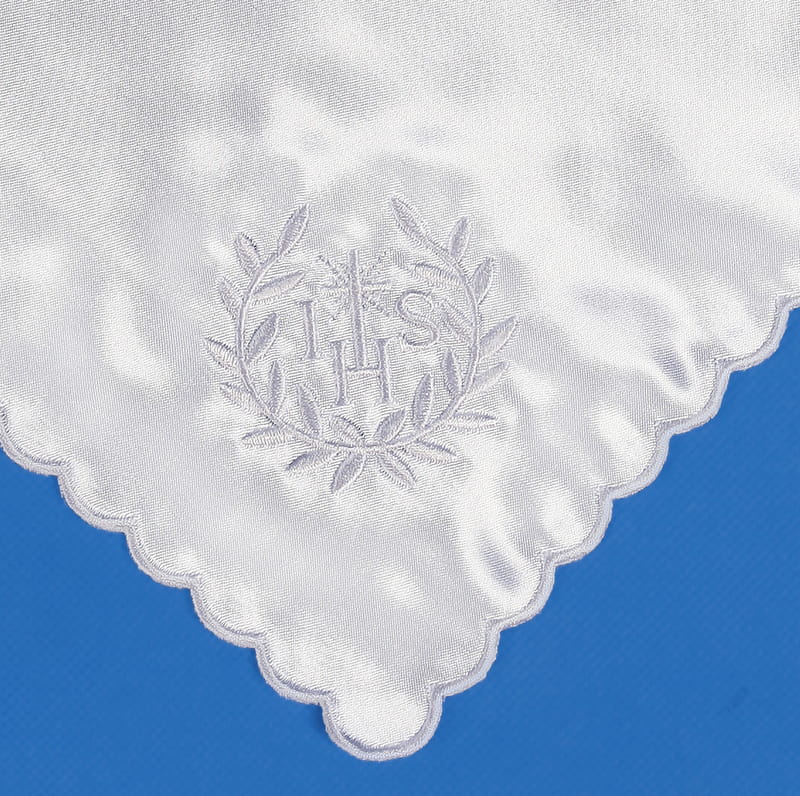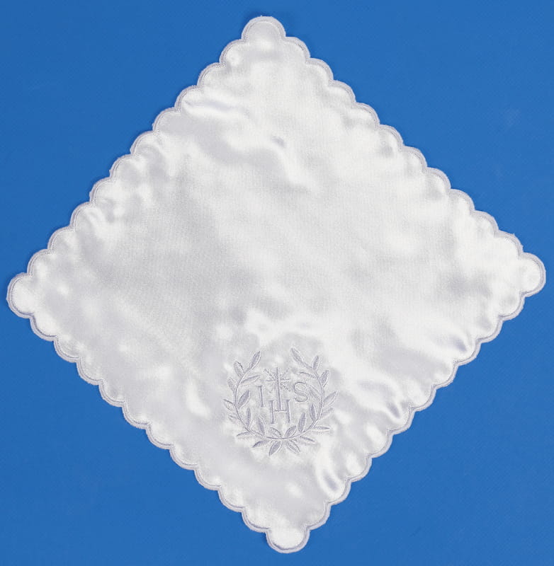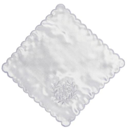 Pamiątkowa chusteczka do komunii wykonana z białej satyny zdobionej pięknym haftem w kolorze białym. Chusteczka w kształcie kwadratu o wymiarach 21,5cm.