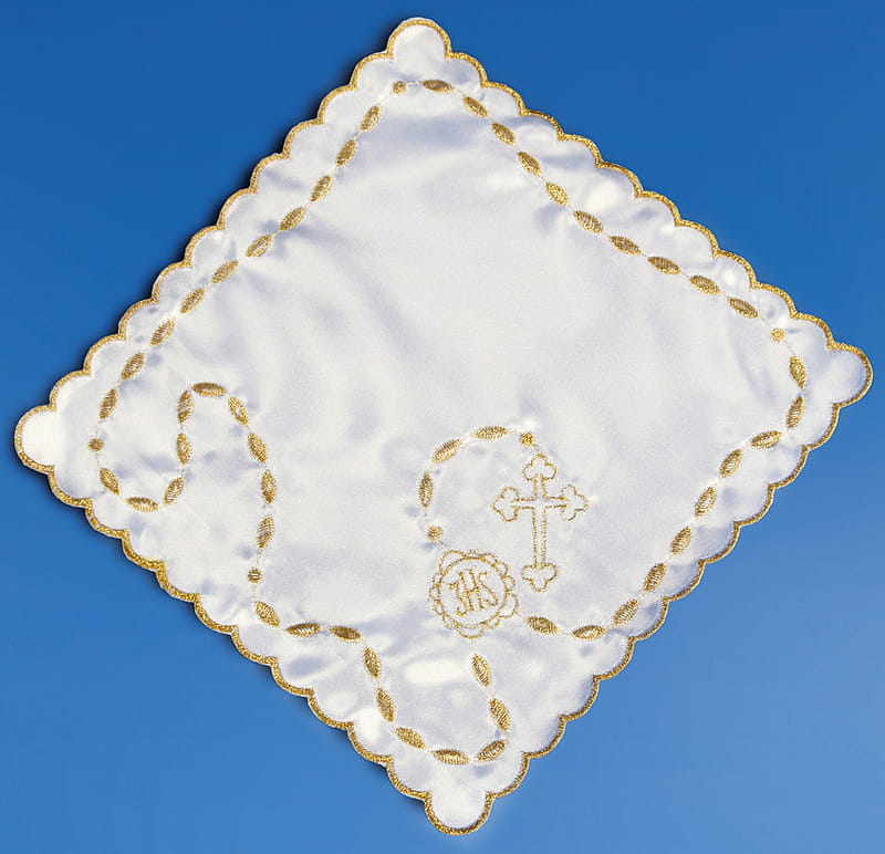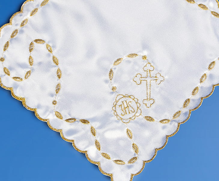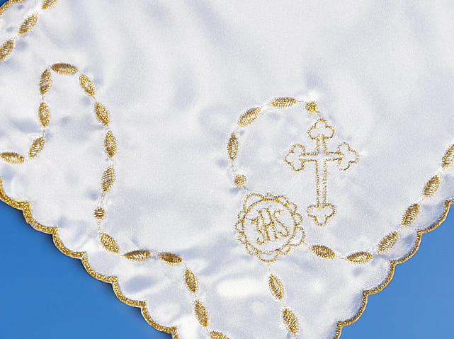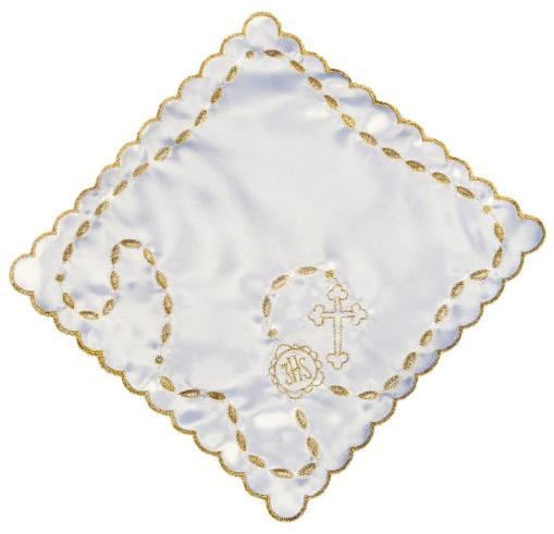 Pamiątkowa chusteczka do komunii wykonana z białej satyny zdobionej pięknym haftem w kolorze złotym. Chusteczka w kształcie kwadratu o wymiarach 21,5cm.