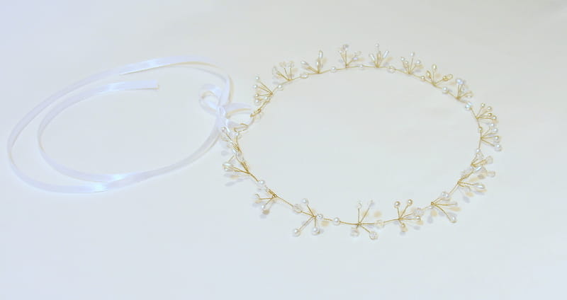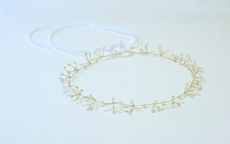 Ręcznie wykonany złoty diadem z kryształów i pereł.