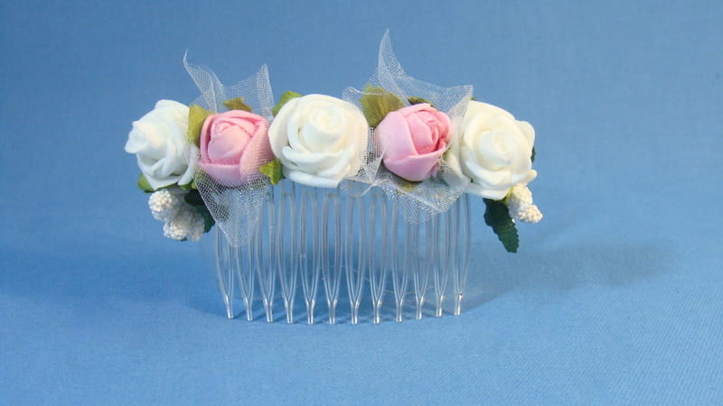 Przezroczysty grzebyk ozdobiony białymi i różowymi różyczkami piankowymi ,dodatkowo przyozdobiony białymi szyszeczkami.