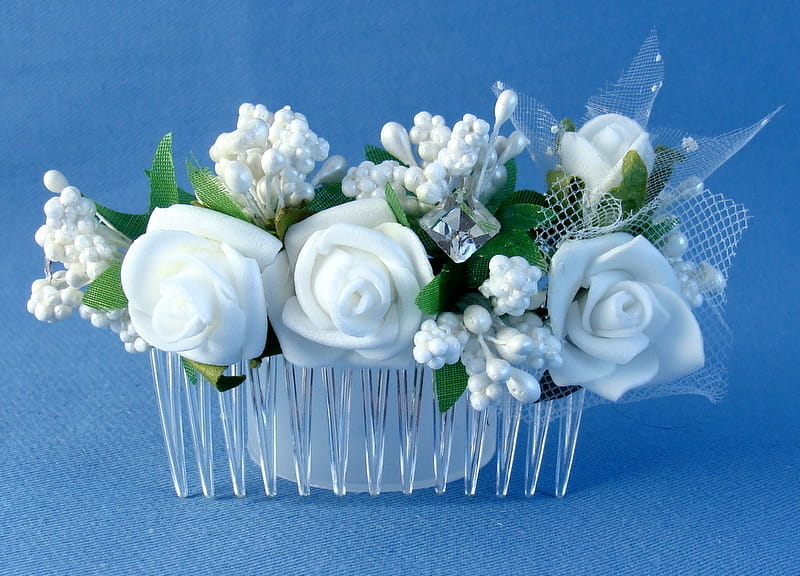 Przezroczysty grzebyk ozdobiony białymi różyczkami piankowymi ,dodatkowo przyozdobiony białymi szyszeczkami i perełkami.