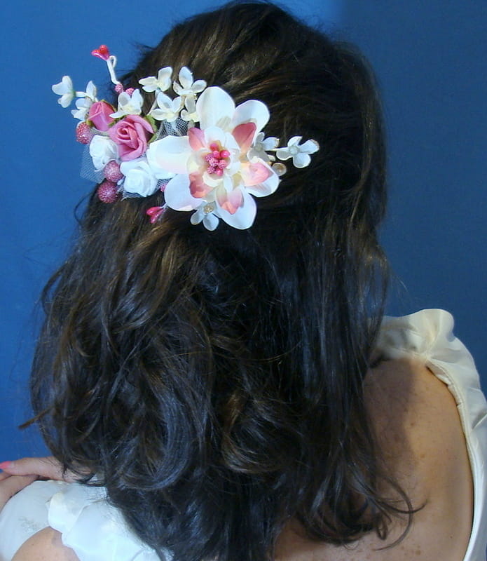 Przypinka do włosów na grzebyku w kolorze biało-bordowym , zdobiona kwiatami, które perfekcyjnie imitują żywe rośliny.