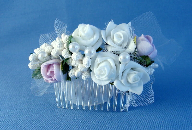 Przezroczysty grzebyk ozdobiony białymi i fioletowymi różyczkami piankowymi ,dodatkowo przyozdobiony białymi szyszeczkami i perełkami.