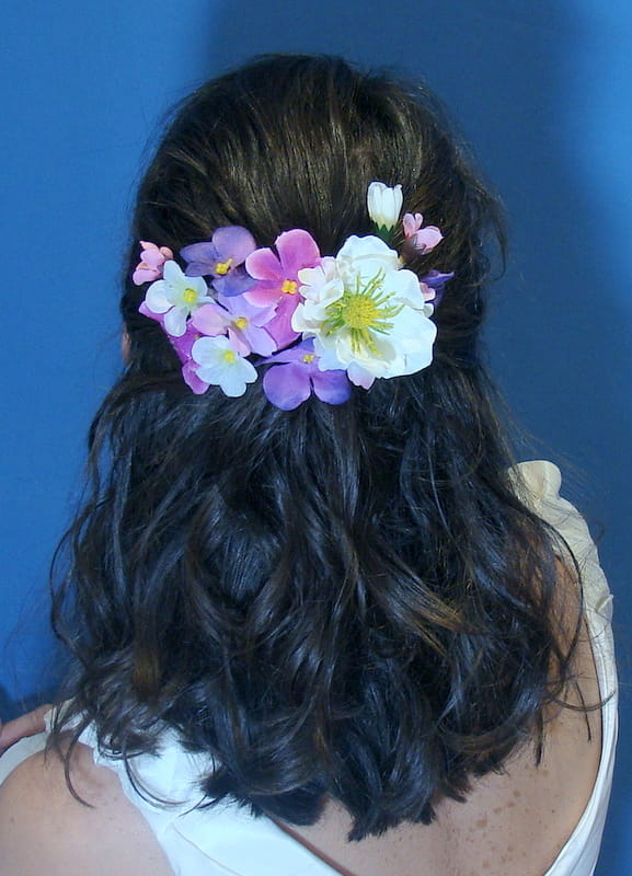 Przypinka do włosów na grzebyku, zdobiona kwiatami, które perfekcyjnie imitują żywe rośliny.
