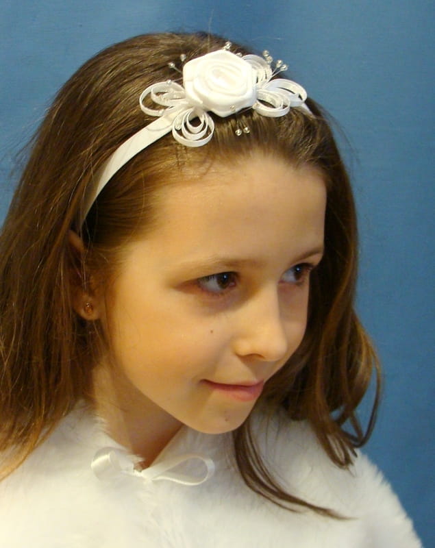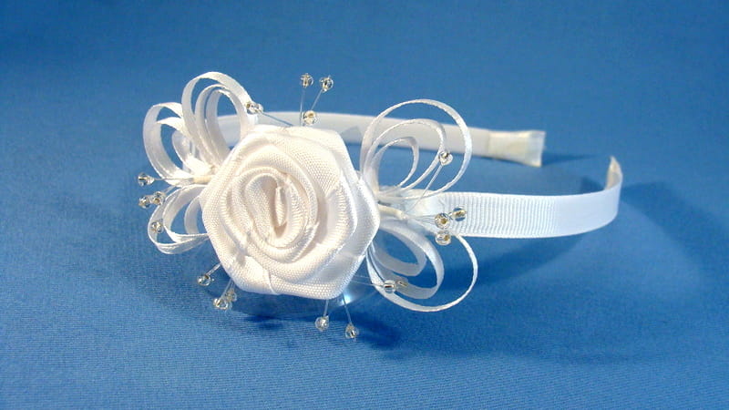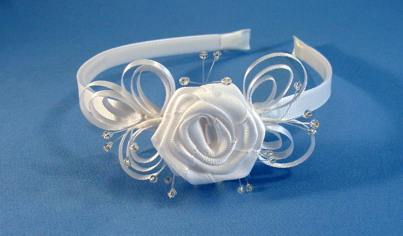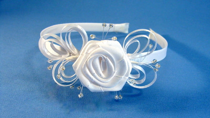Kompozycja wykonana z satynowej róży wokół której znajdują się atłasowe "pawie oka" . Całość zdobią srebrne koraliki na żyłach