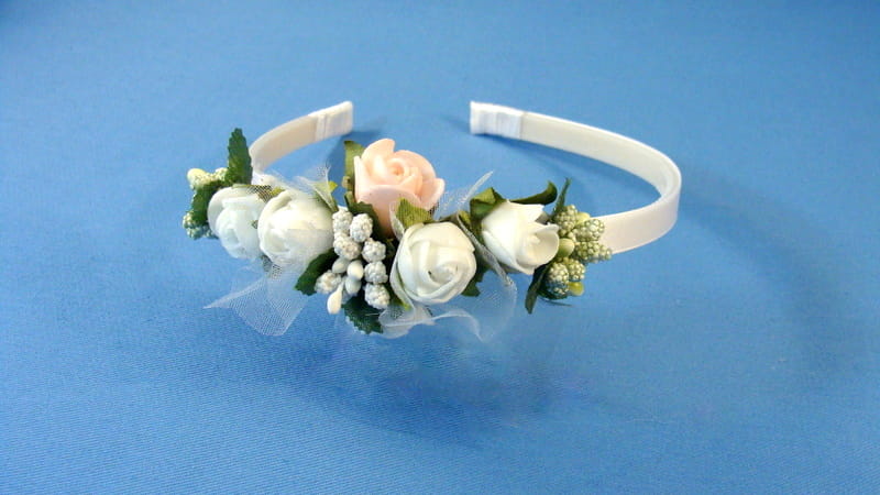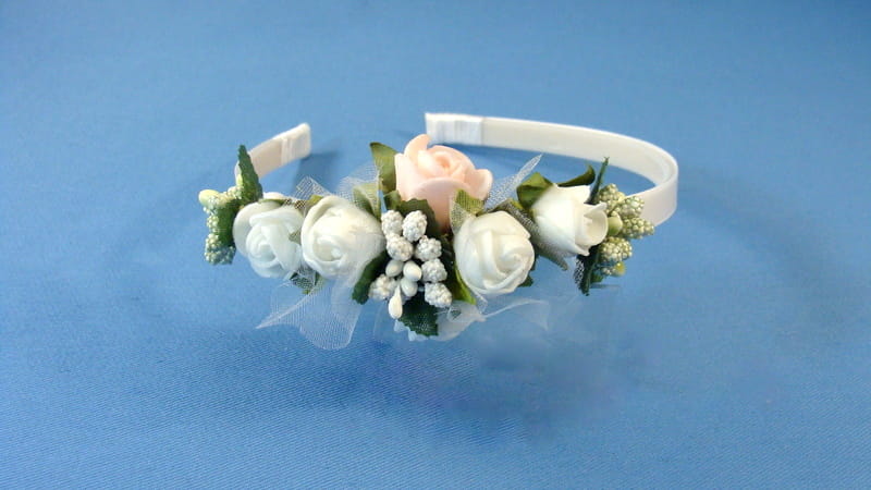 Opaska z białych i różowych różyczek piankowych ozdobiona białymi i zielonymi szyszeczkami.
