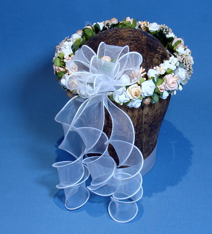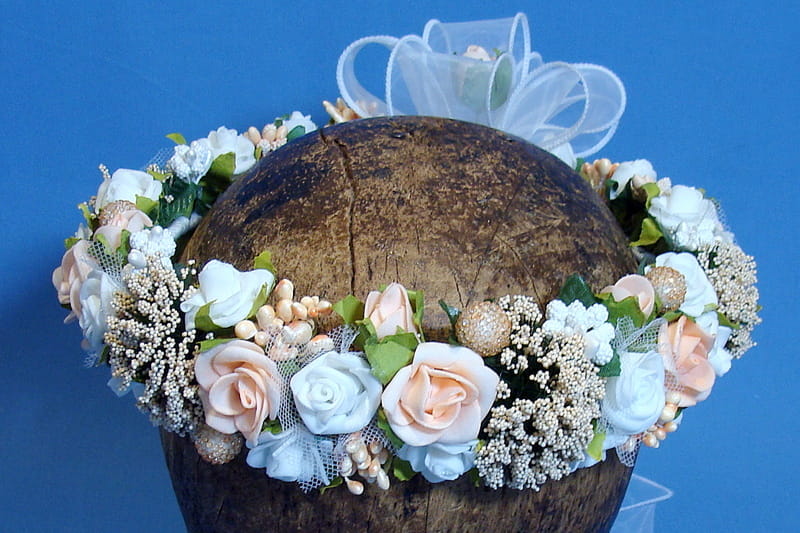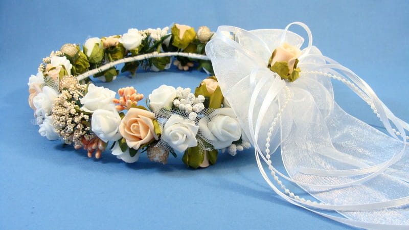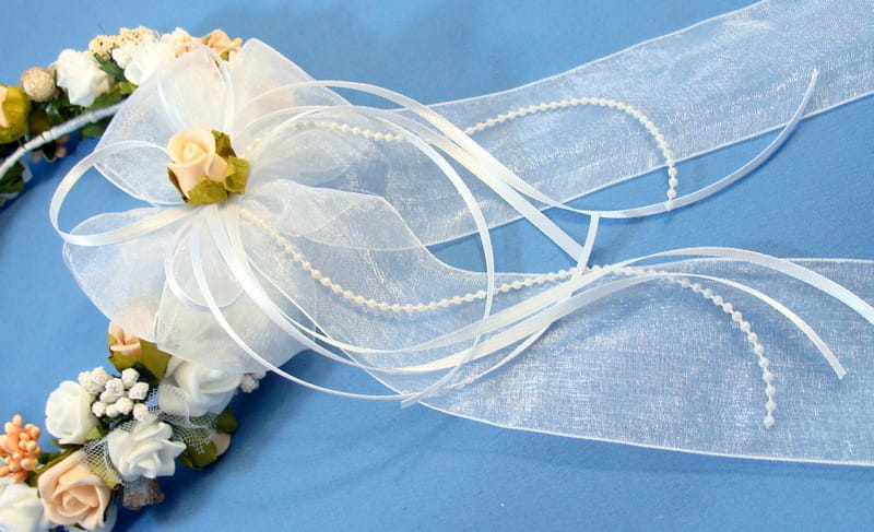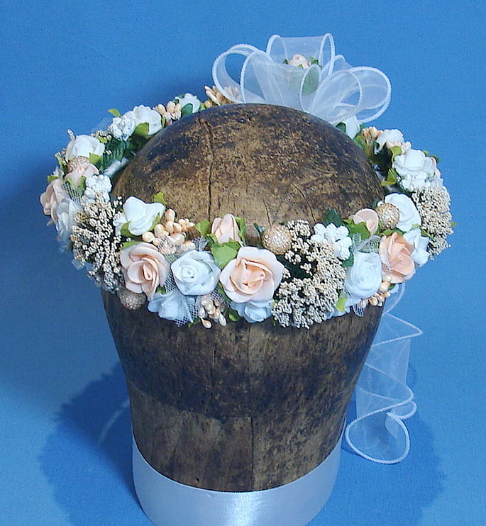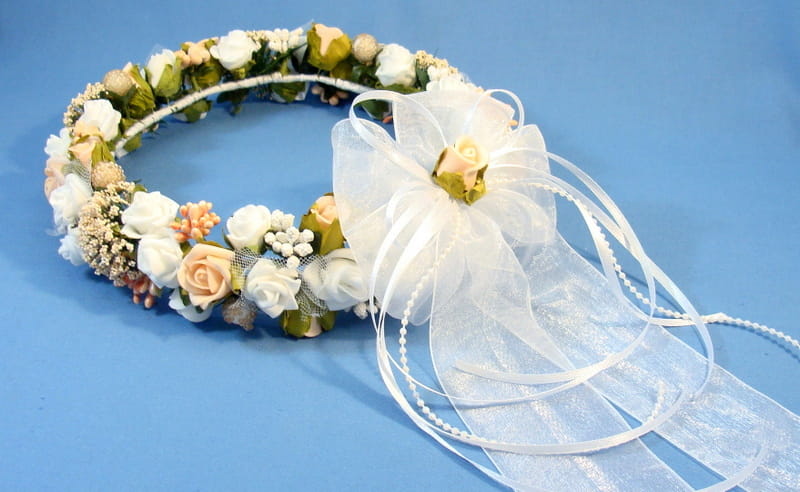 Trzeci wariant tyłu wianka -Tył wianka ozdabia biała , atłasowa kokarda , atłasowe tasiemki, perełki nanizane na sznureczek i komponująca się z całym wiankiem różyczka. Przy wyborze tego wariantu prosimy o dopisanie w uwagach : KOKARDA Z ATŁASU.