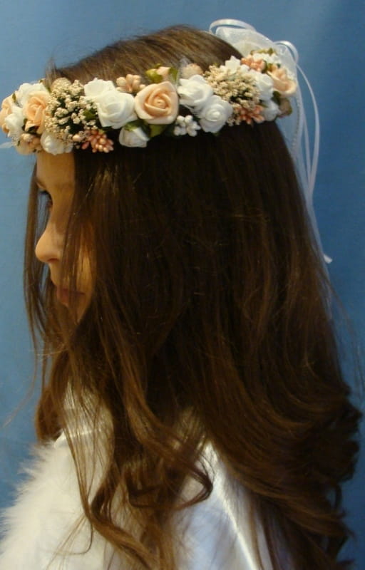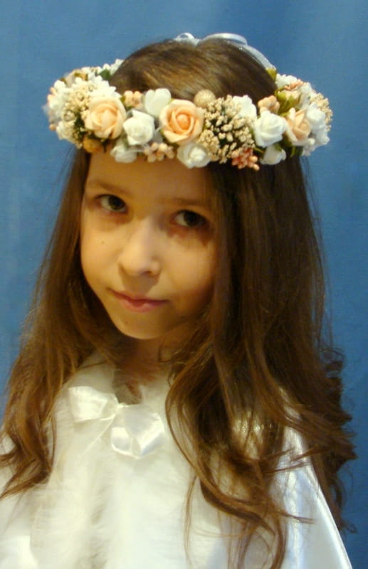 Wianek skomponowany z białych i łososiowych różyczek , przyozdobionych białymi i łososiowymi elementami (szyszeczki, pręciki, mieniące się kulki, kaszka na pręcikach). Spod każdej różyczki wychodzą zielone listki.