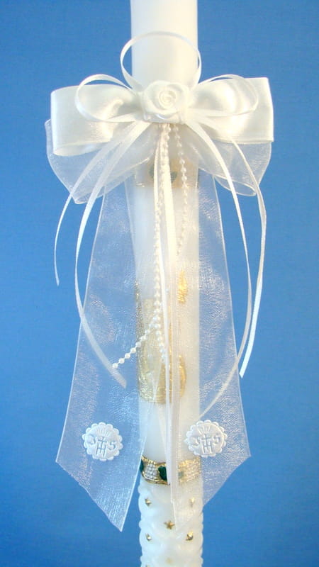 Biała, szyfonowo - atłasowa kokardka z gumką, ozdobiona różyczką , tasiemkami i perełkami.
