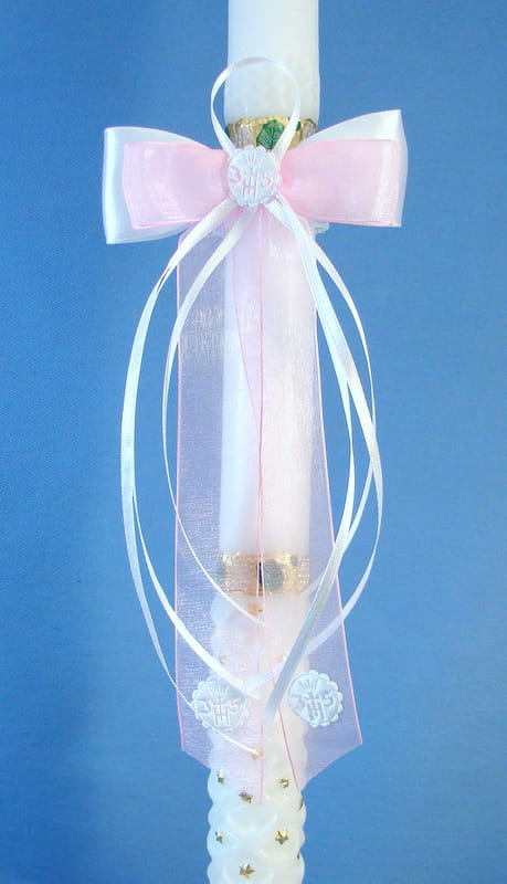 Szyfonowo - atłasowa kokardka z gumką, ozdobiona emblematami i tasiemkami w kolorze białym i różowym.