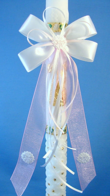 Szyfonowo - atłasowa kokardka z gumką, ozdobiona emblematami i tasiemkami w kolorze białym i różowym.