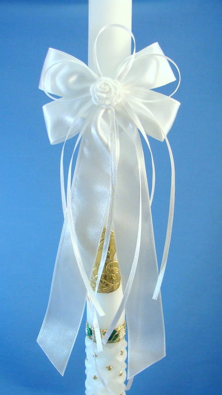 Biała, atłasowa kokardka z gumką, ozdobiona różyczką i tasiemkami.