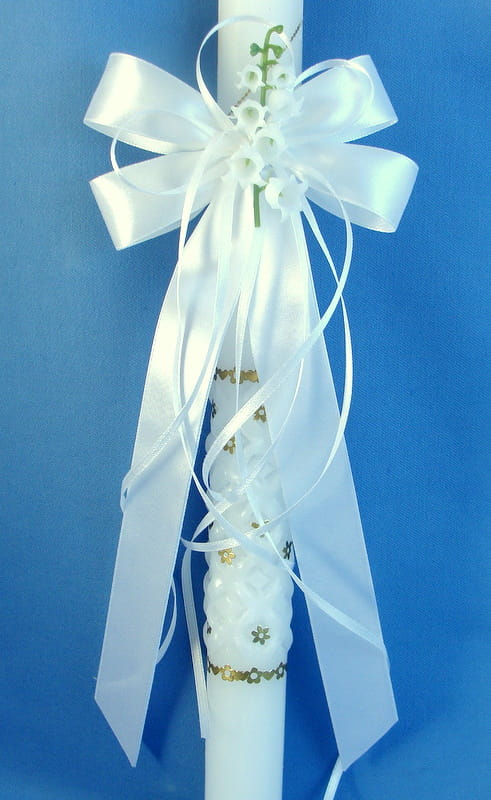 Atłasowa kokardka z gumką, ozdobiona gałązką konwalii i tasiemkami w kolorze białym .