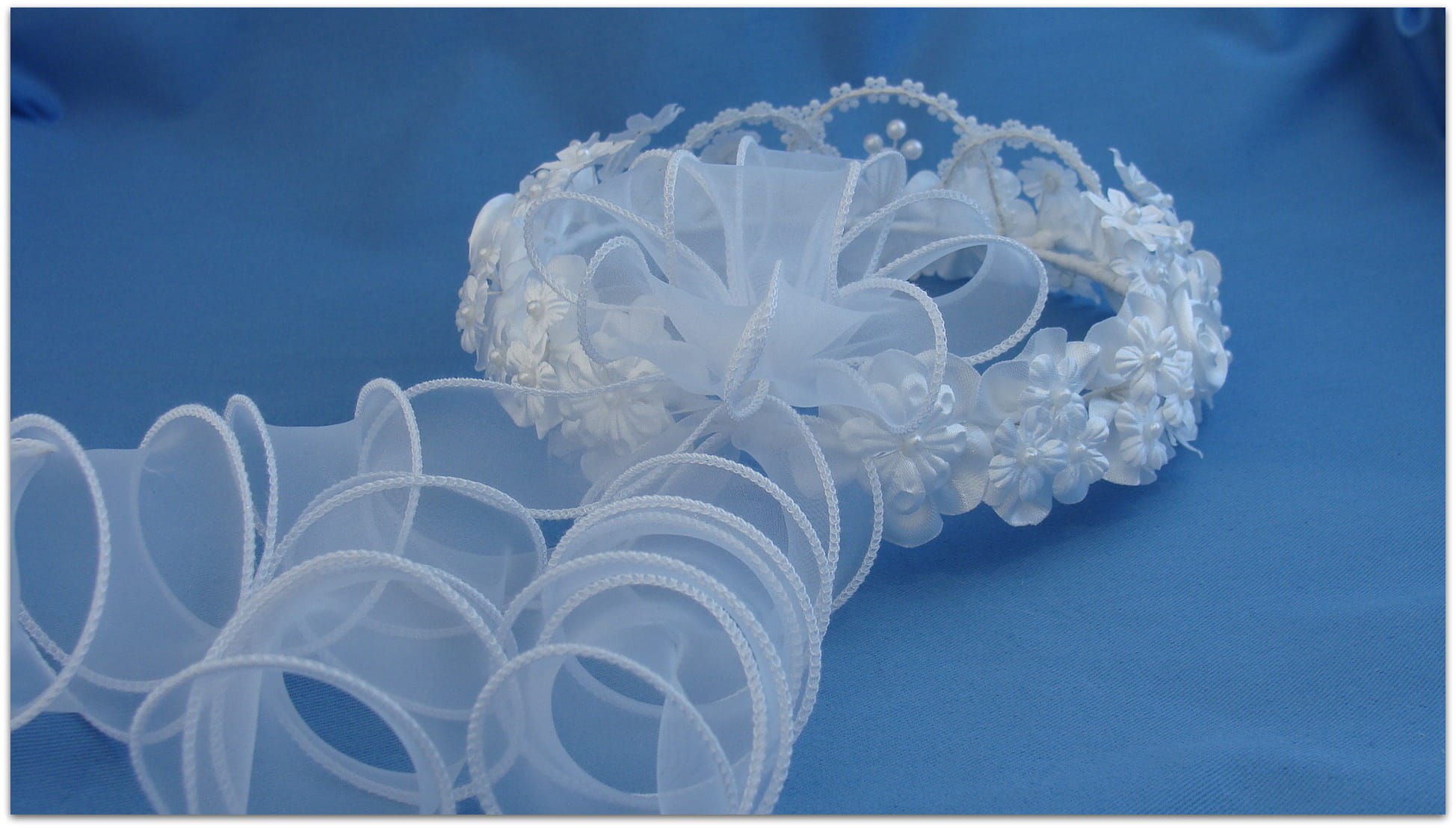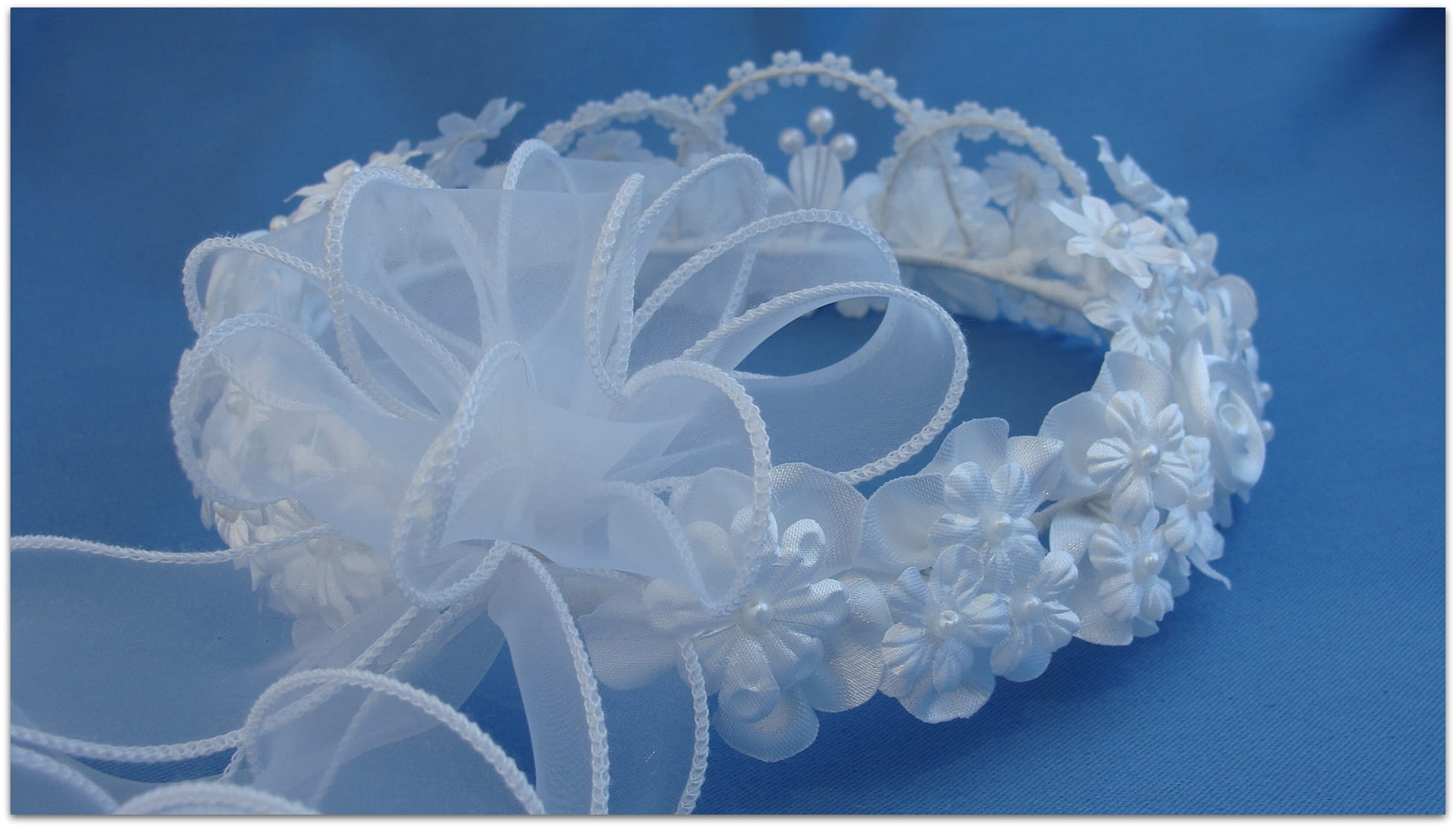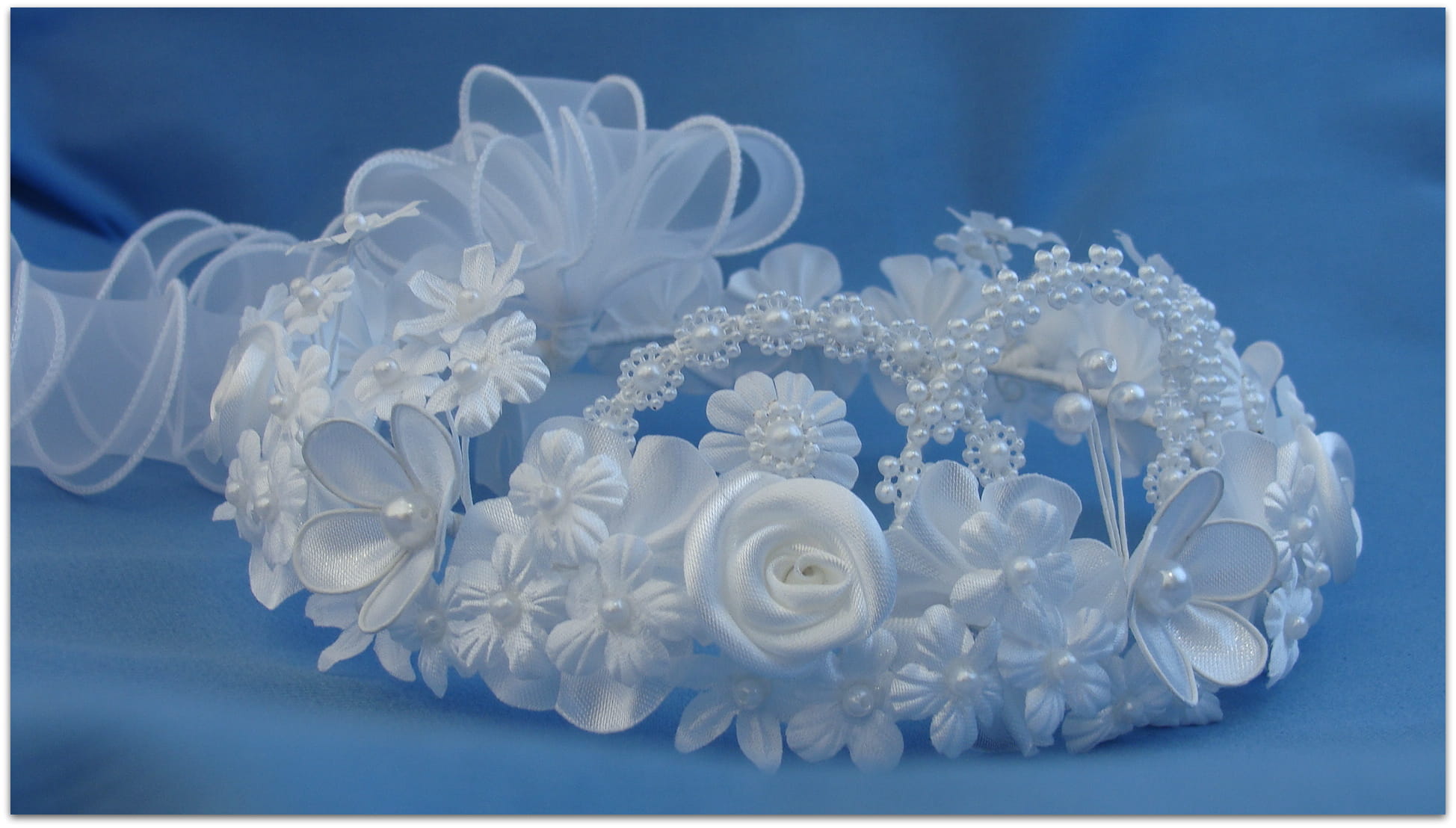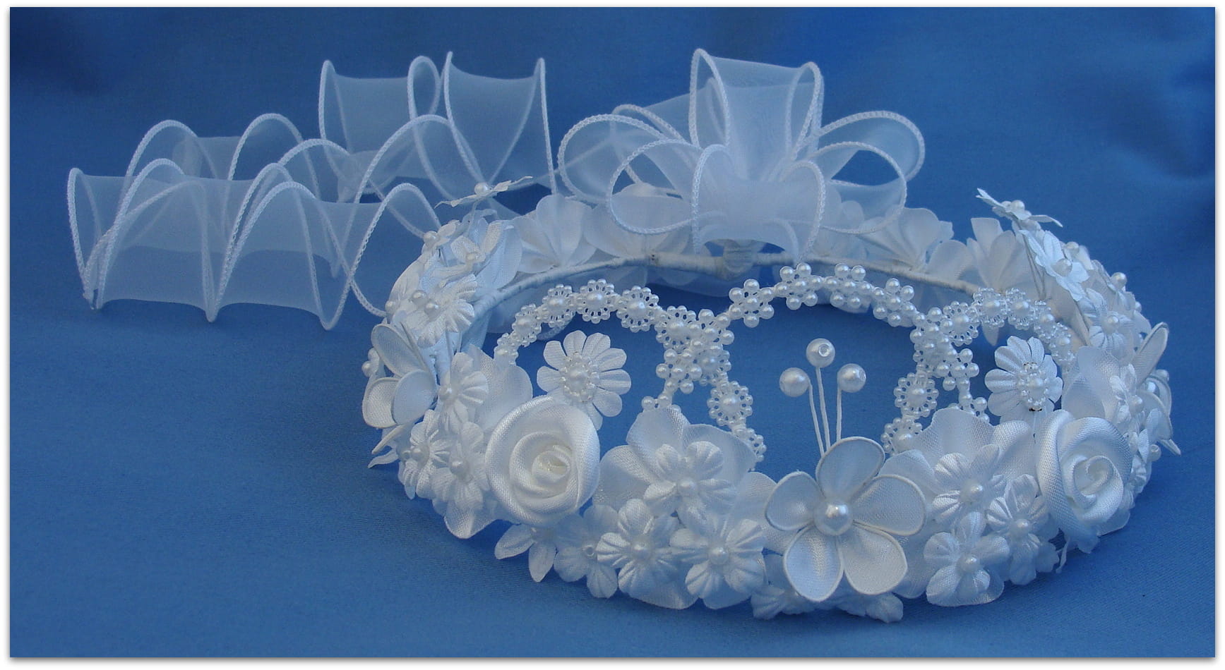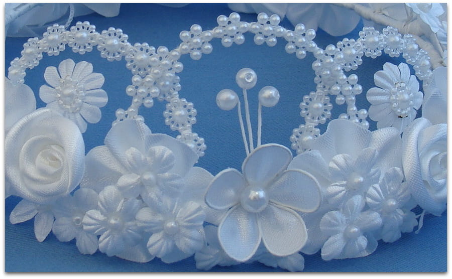 Jak sama nazwa wianka wskazuje, Królewna Fiona jest iście królewską, bogatą ozdobą głowy. Wianek składa się z 4 ręcznie robionych, atłasowych różyczek i 3 również ręcznie robionych, atłasowych, większych kwiatów przyozdobionych perełkami. Pomiędzy różyczkami i większymi kwiatkami znajdują się liczne przyozdobione perełkami mniejsze kwiatuszki, znajdujące się na przymarszczonych podkładkach. Z przodu wianka znajduje się "korona" z perłowej taśmy i trzy większe perełki. Tył wianka wykończony jest organdynową kokardą z trzema lokami wykonanymi z tego samego materiału.