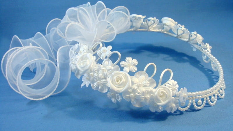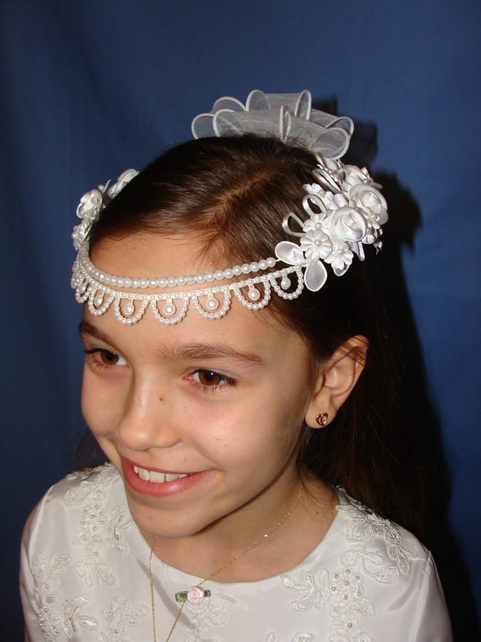 Tył wianka wykończony jest organdynową kokardą z trzema lokami wykonanymi z tego samego materiału.Wianek bardzo elegancki i często kupowany.