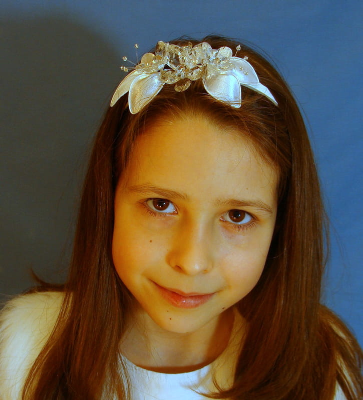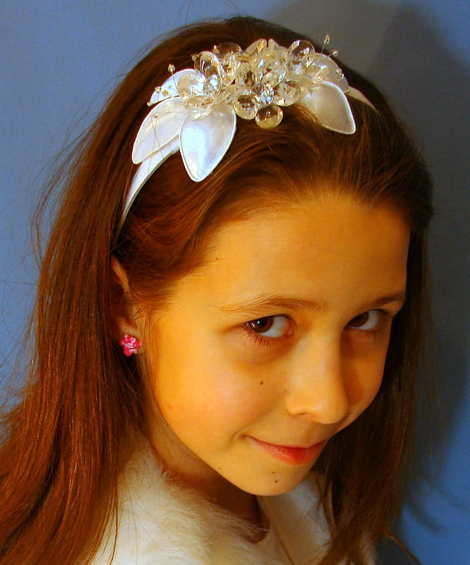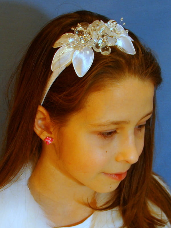 Niezwykle błyszczące kryształowe kwiatki osadzone w białych, atłasowych listkach są główną ozdobą opaski Matylda. Dodatkowo ozdabiają opaskę wystające ponad kryształy srebrne kulki .