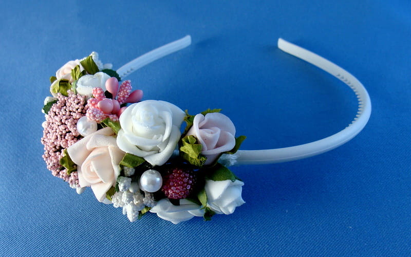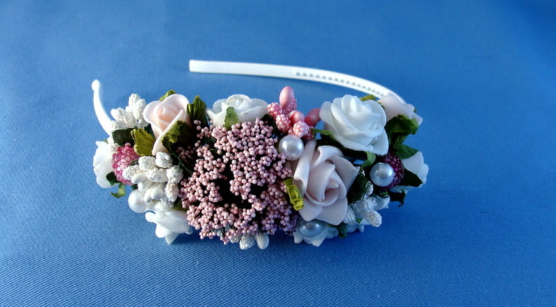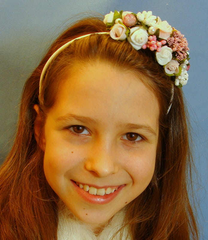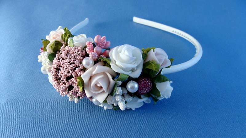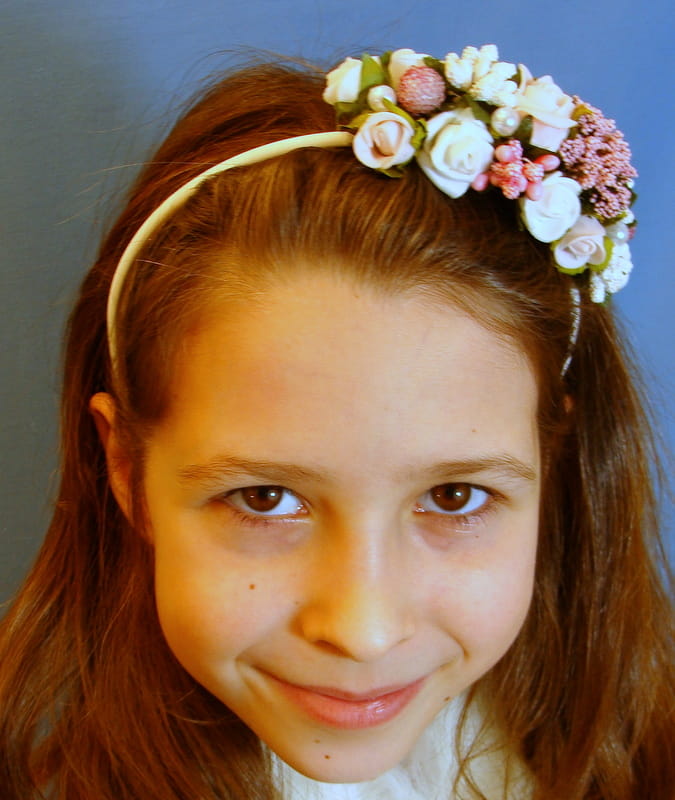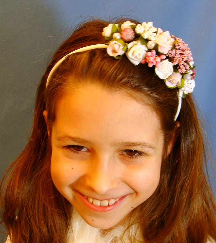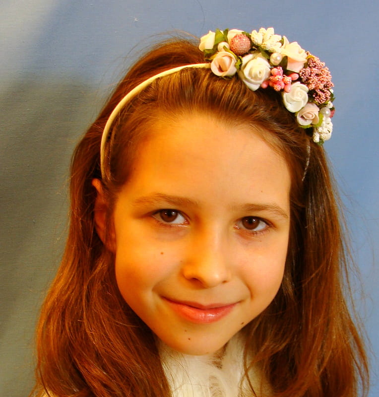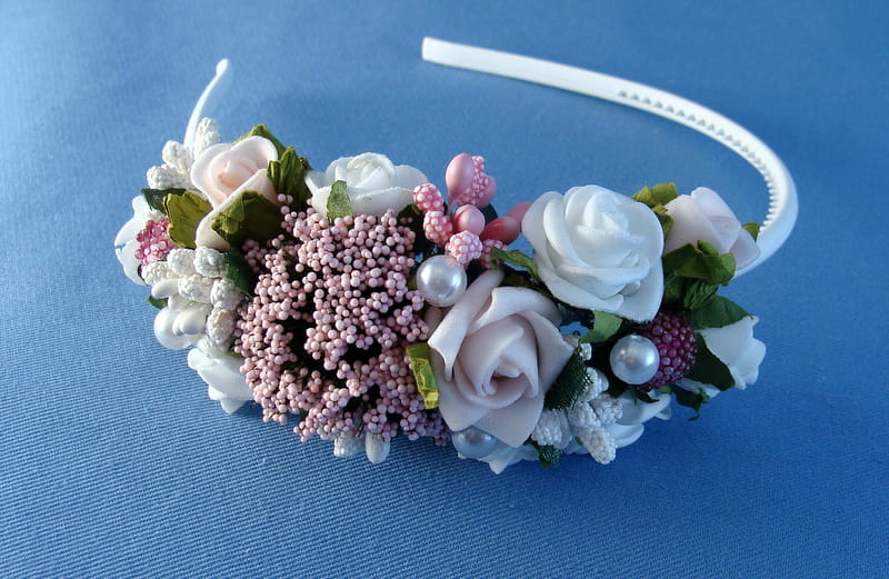 Opaska Agusia skomponowana jest z białych i różowych różyczek , przyozdobionych białymi i różowymii elementami (szyszeczki, pręciki, mieniące się kulki, kaszka na pręcikach) i perełkami. Spod każdej różyczki wychodzą zielone listki.