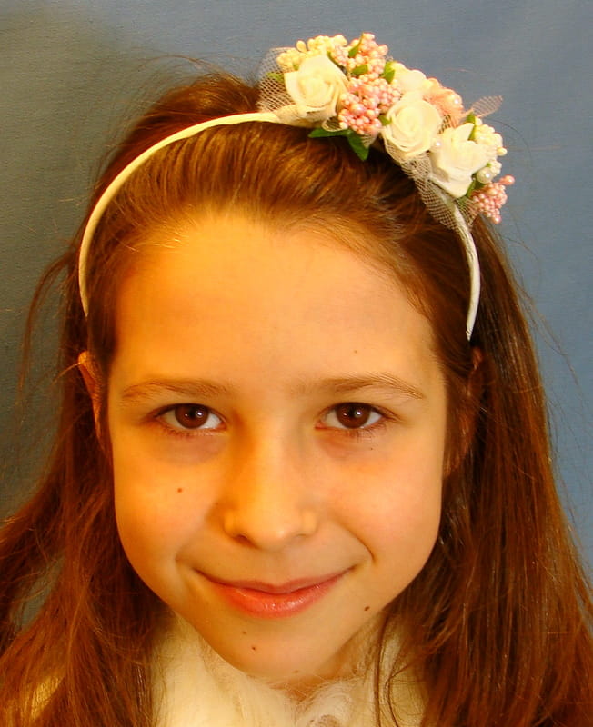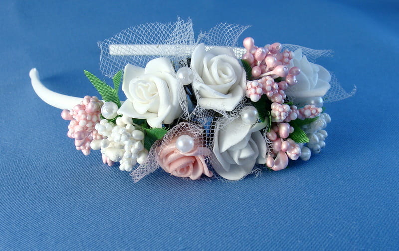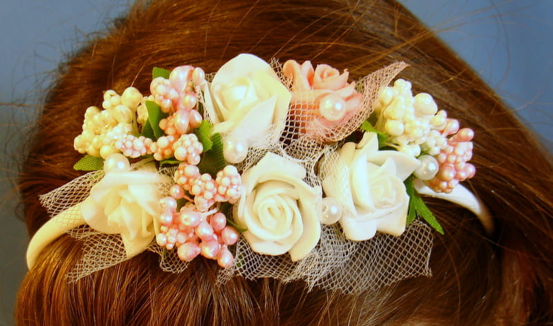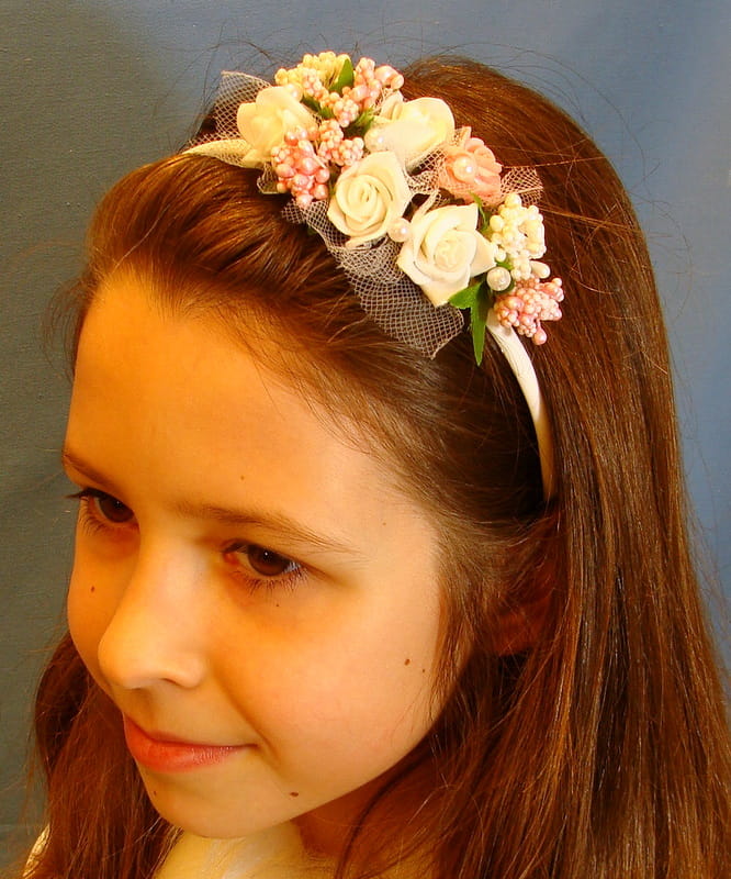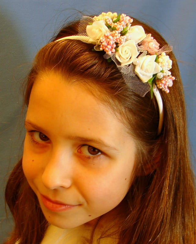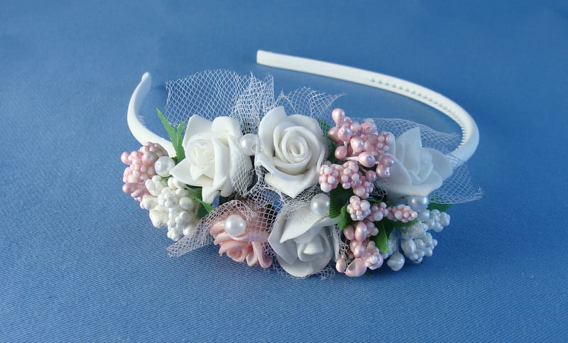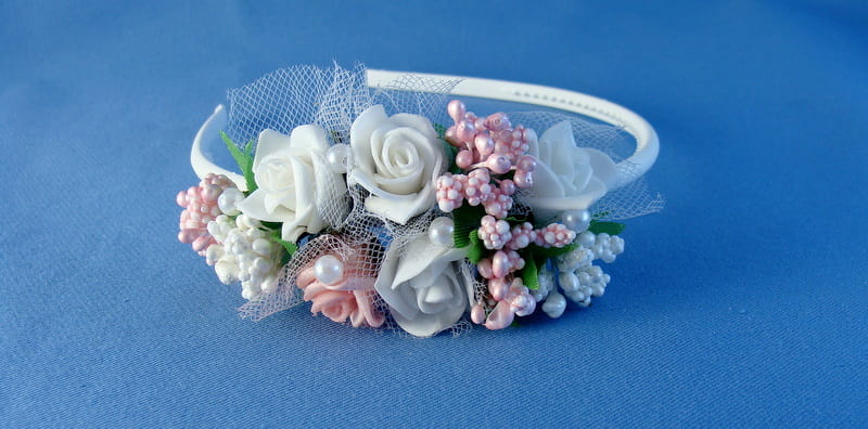 Opaska z białych i różowych różyczek piankowych ozdobiona białymi i różowymi szyszeczkami. Różyczki otula tiul . Spod szyszeczek wychodzą zielone listki. Opaskę dodatkowo zdobią perełki.