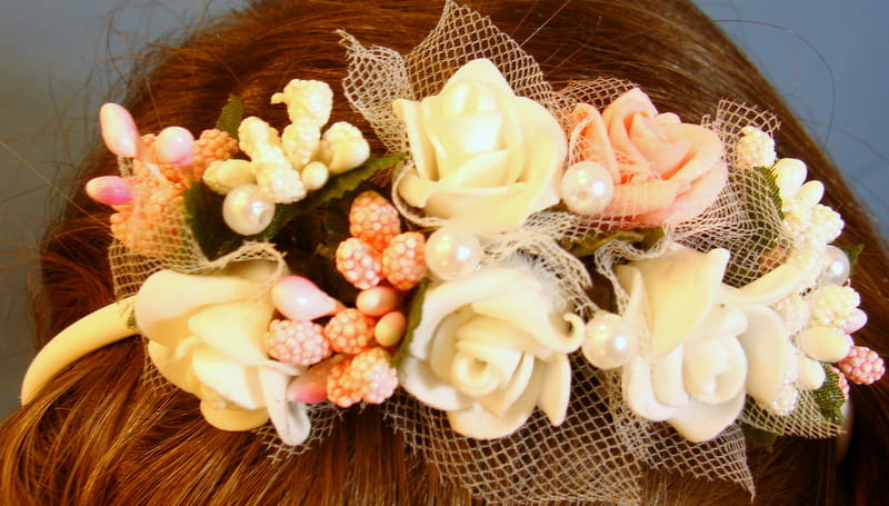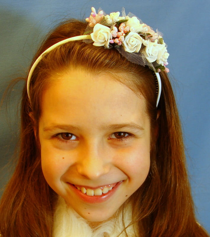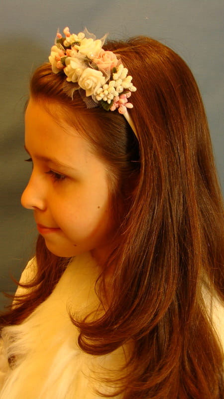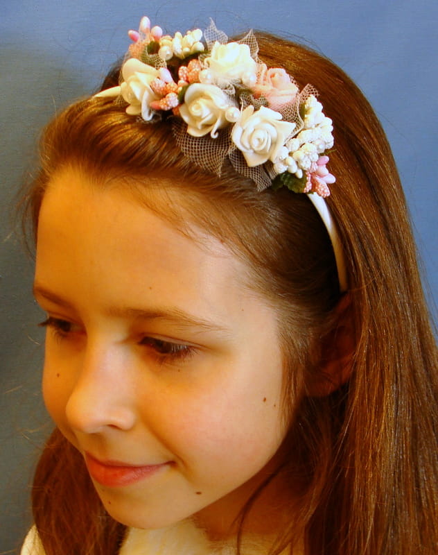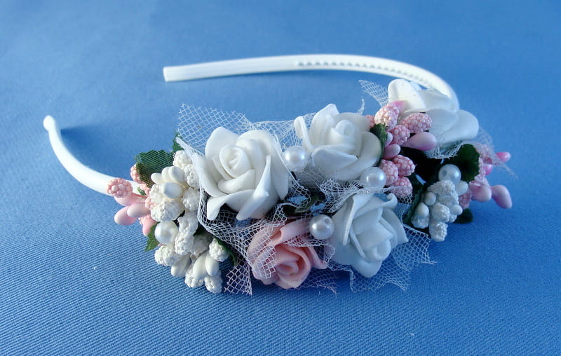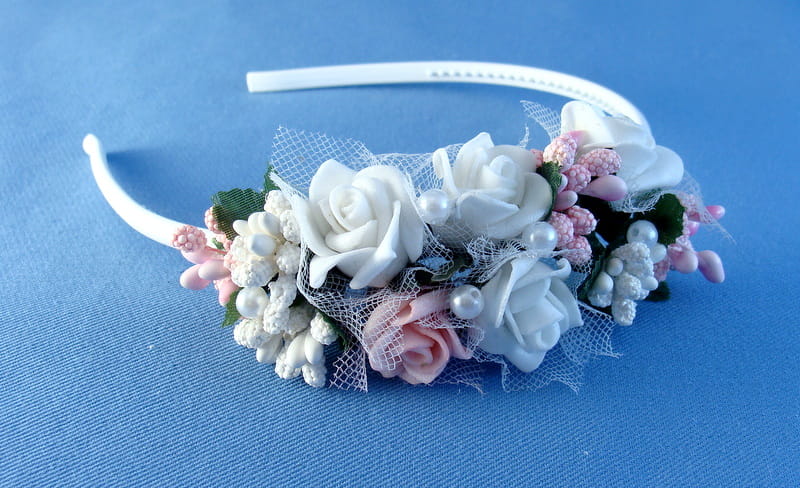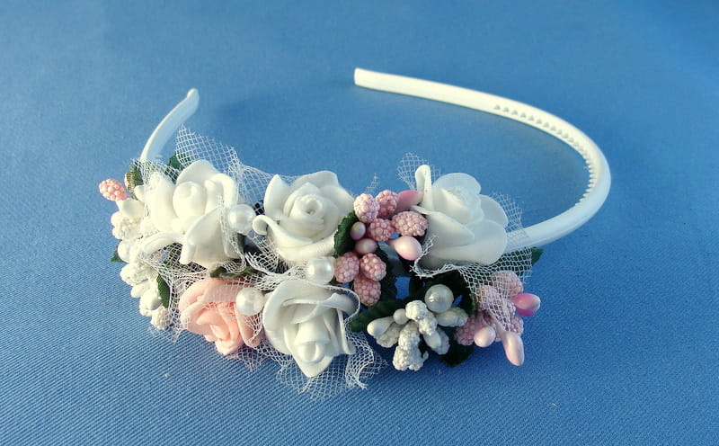 Opaska z białych i różowych różyczek piankowych ozdobiona białymi i różowymi szyszeczkami oraz perełkami.