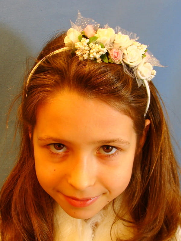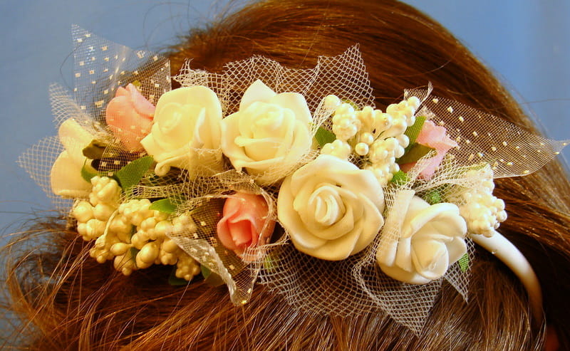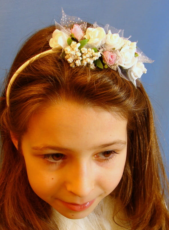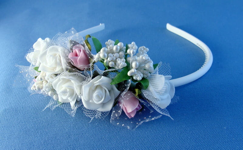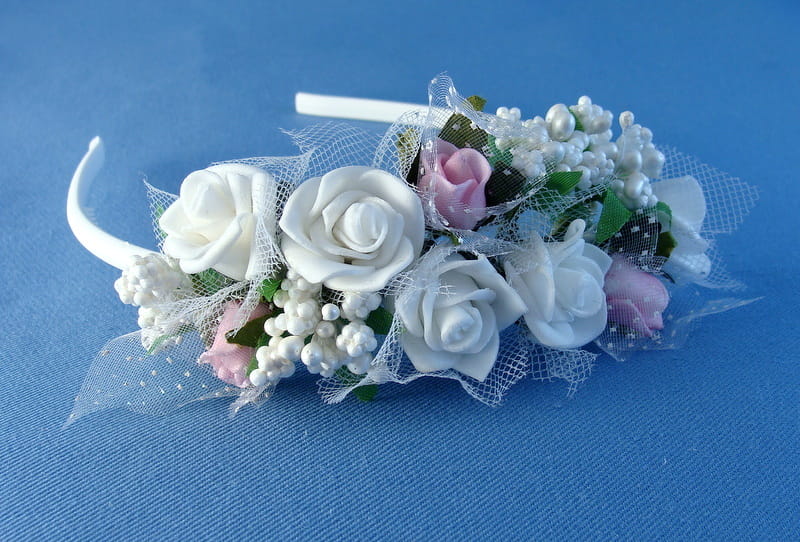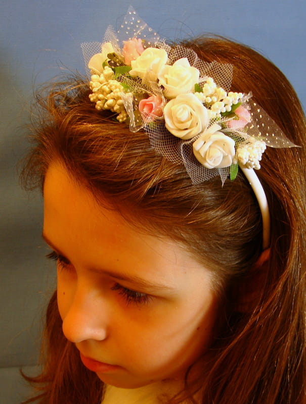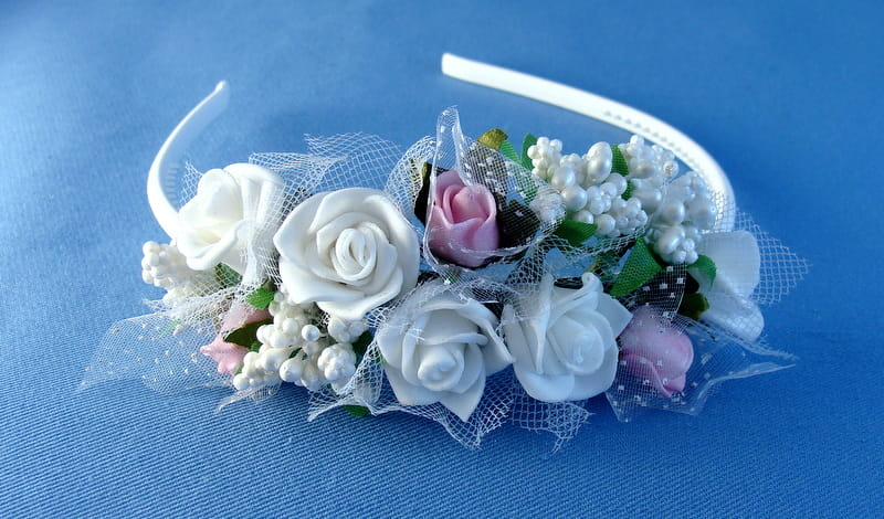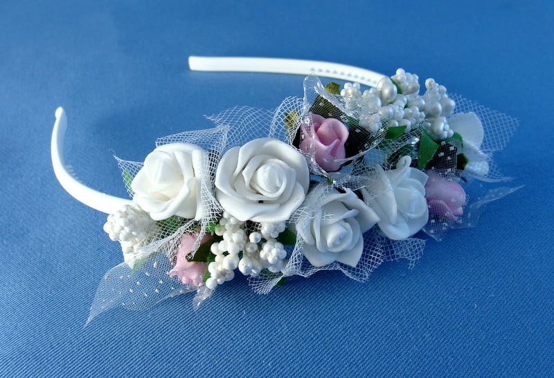 Opaska z białych różowych różyczek piankowych ozdobiona białymi szyszeczkami. Różyczki otula tiul i tiul z kropeczkami.
