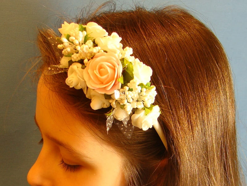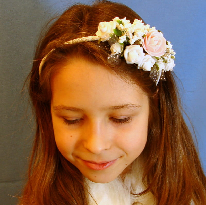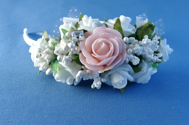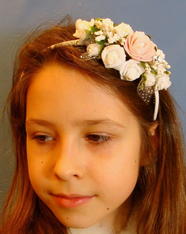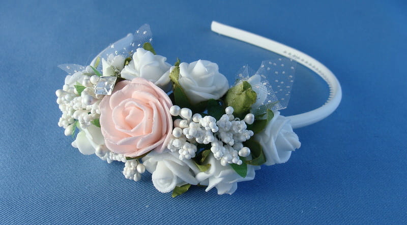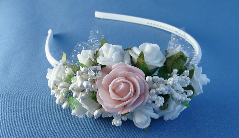 Opaska z białych i różowych różyczek piankowych ozdobiona białymi szyszeczkami.
