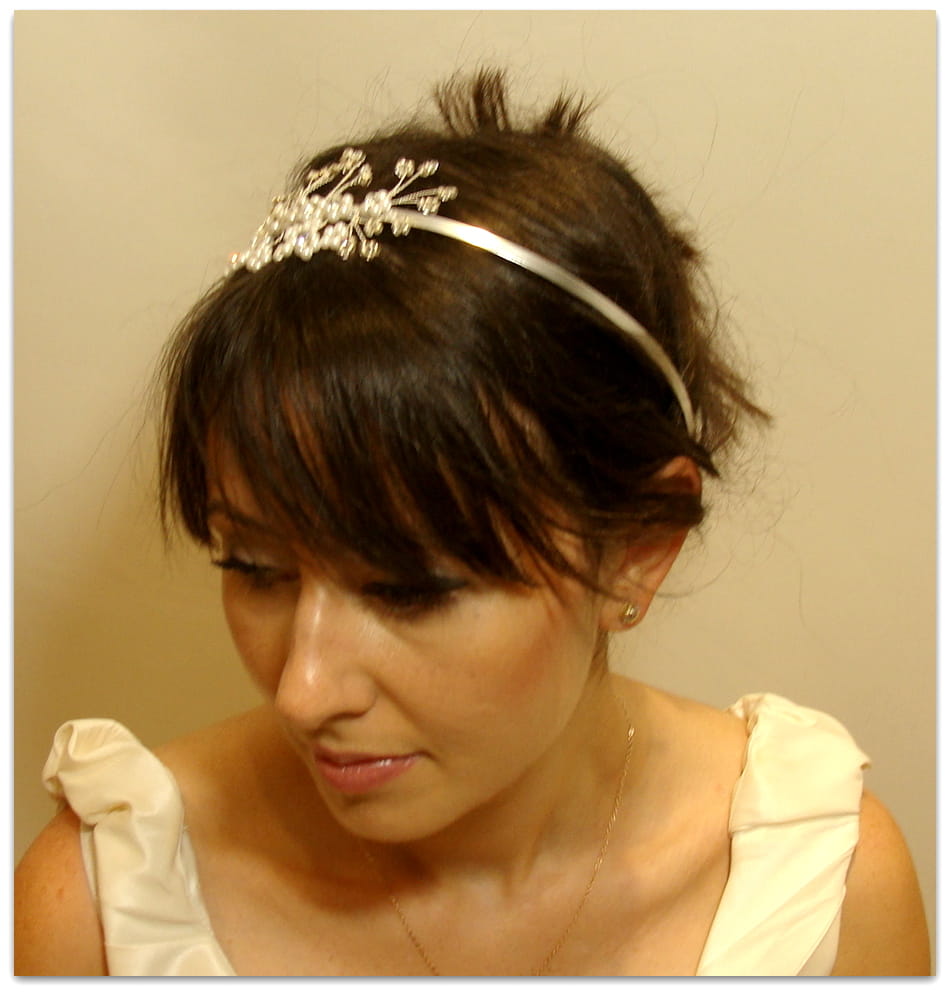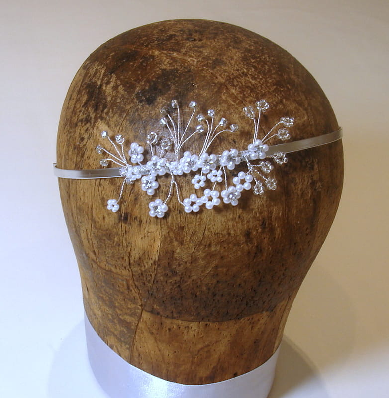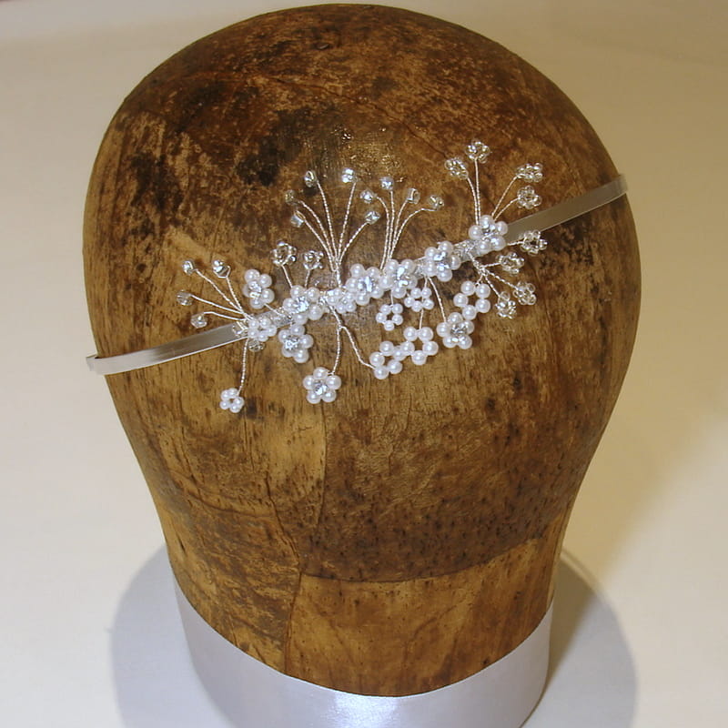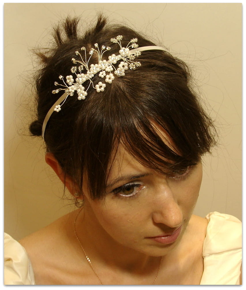 Ręcznie wykonana opaska w tonacji srebrnej ze srebrnymi,kryształowymi i perłowymi elementami . Cyrkonie i perełki tworzące kompozycję nanizane są na srebrny drucik. Romantyczna ozdoba do upięć lub rozpuszczonych włosów.