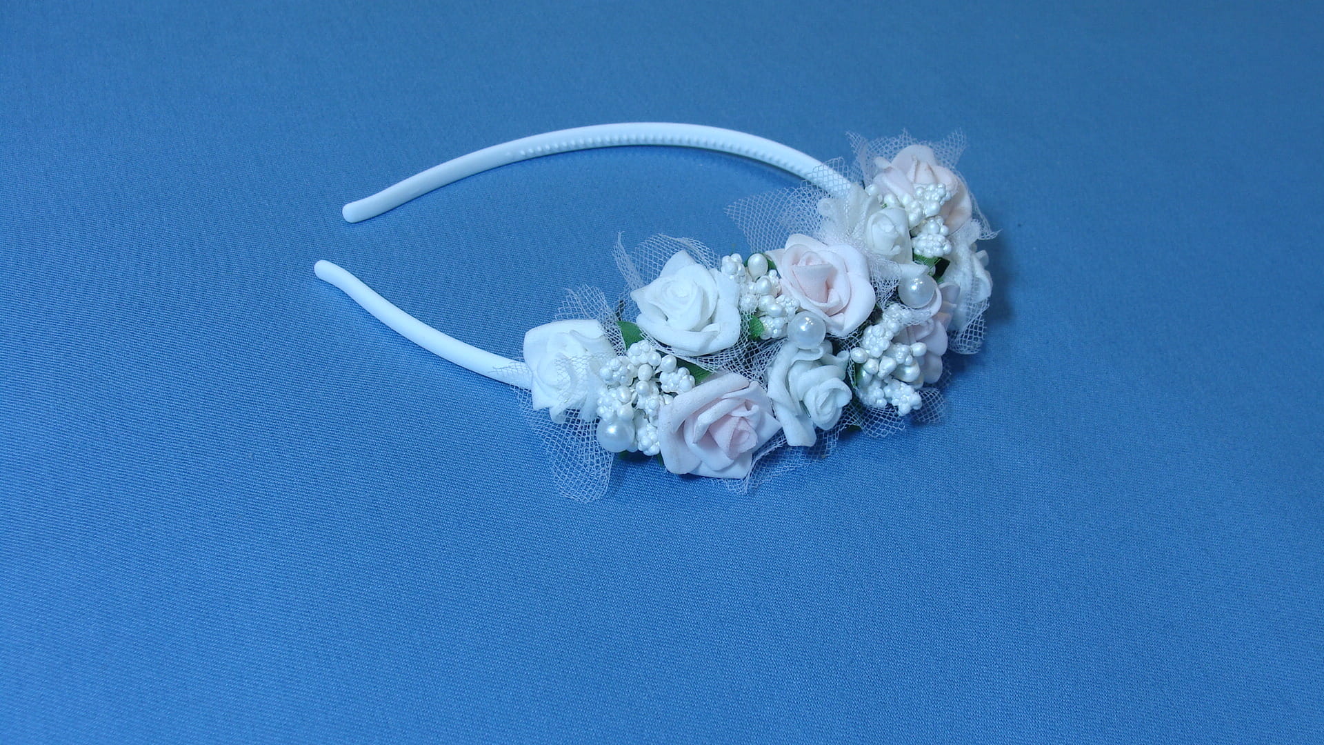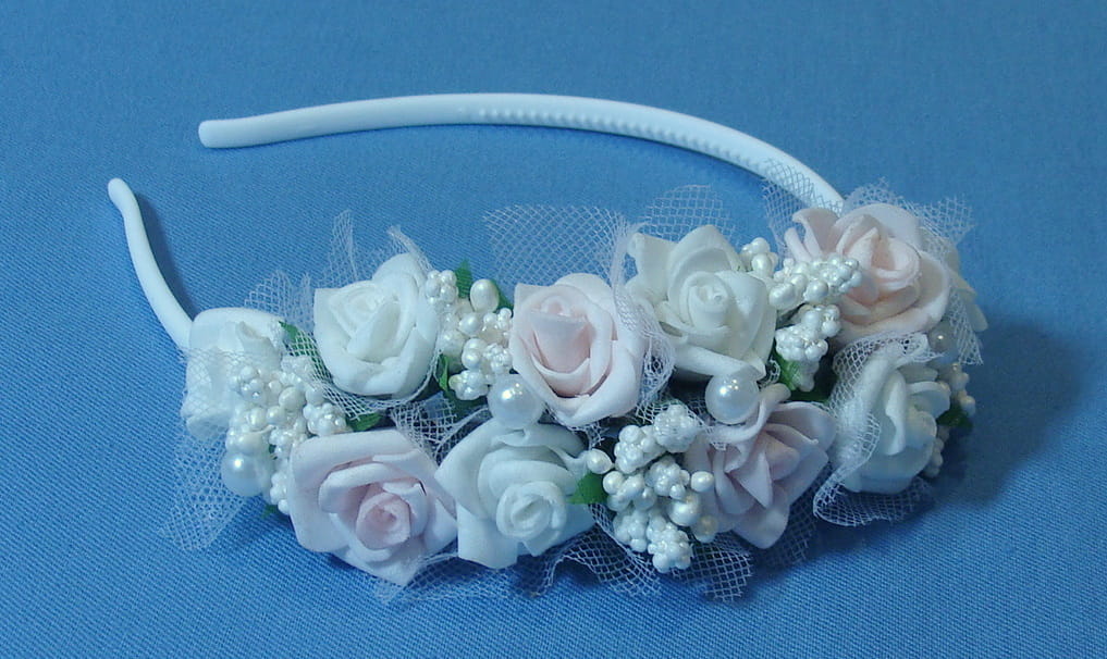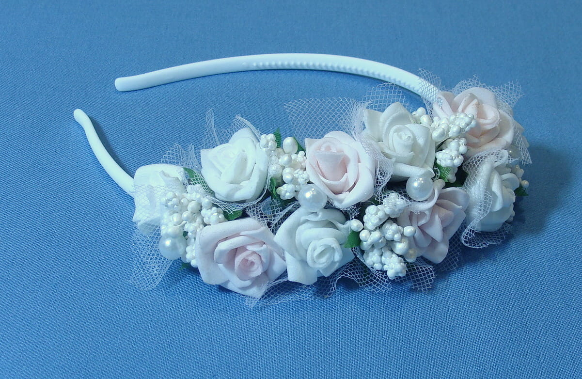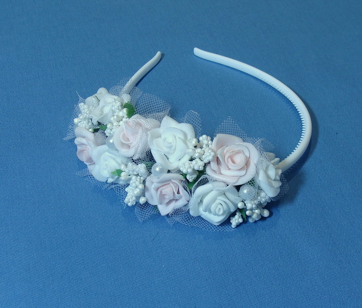 Opaska komunijna wykonana z kwiatków piankowych, które wiernie odzwierciedlają żywe kwiaty.