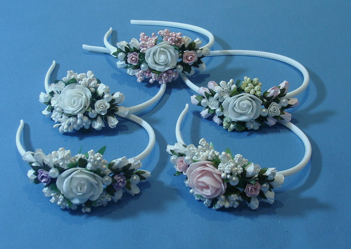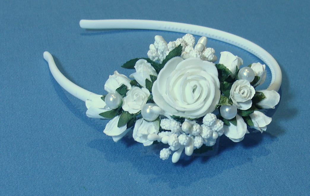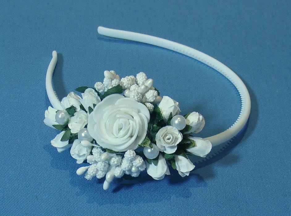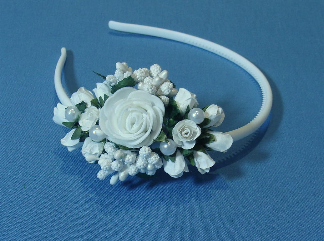 Opaska komunijna wykonana z kwiatków piankowych, które wiernie odzwierciedlają żywe kwiaty.
