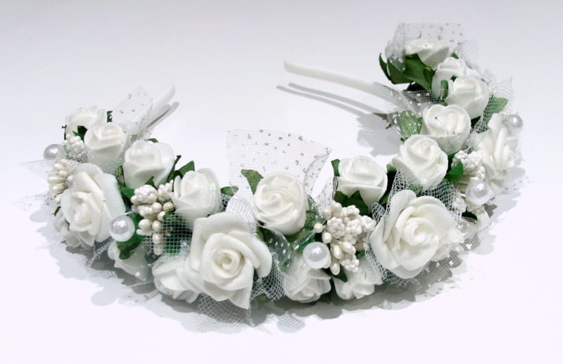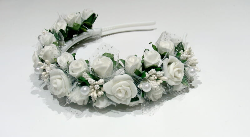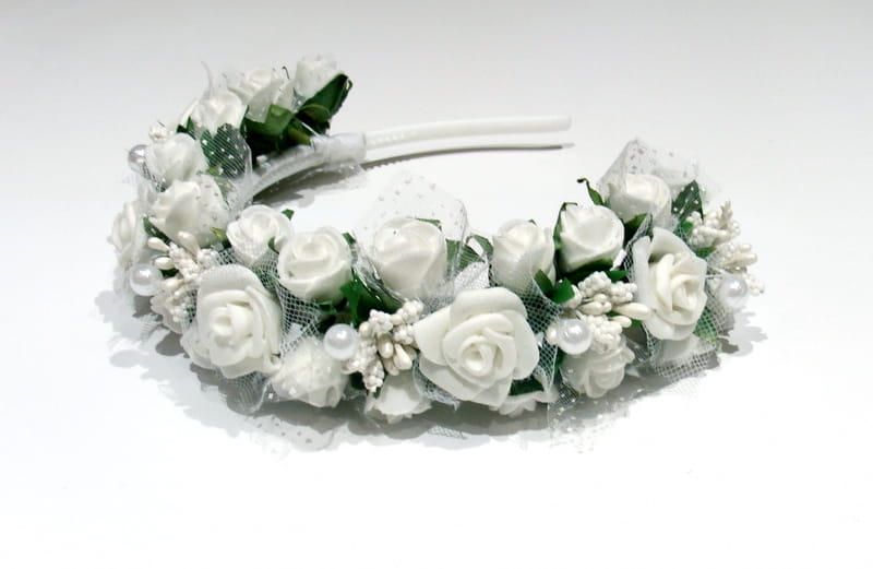Opaska komunijna w kolorach białym i zielonym , wykonana z kwiatków piankowych, które wiernie oddają żywe kwiaty.