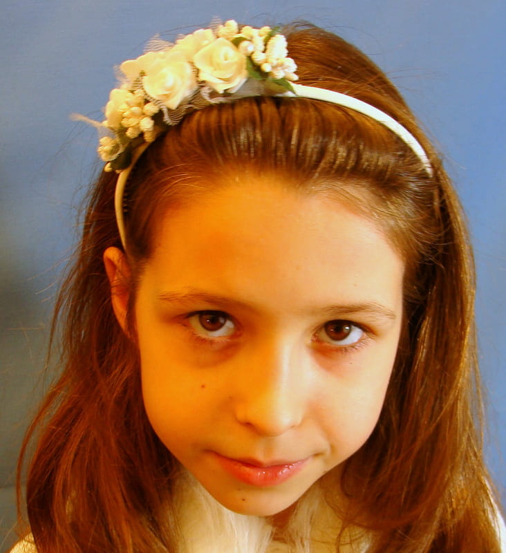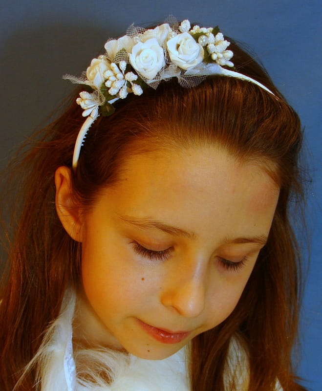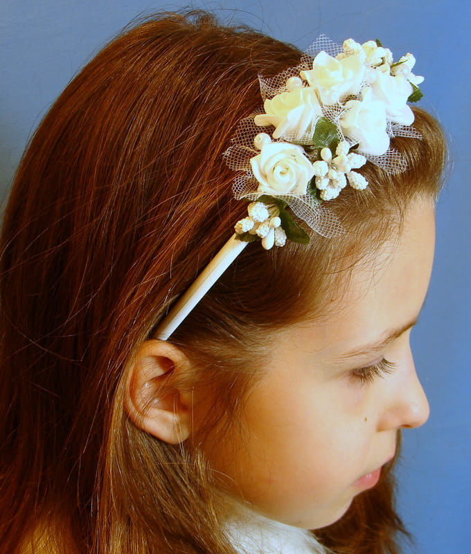 Opaska z białych różyczek piankowych otulonych tiulowym okółkiem, ozdobiona białymi szyszeczkami. Dodatkowo opaskę zdobią perełki.