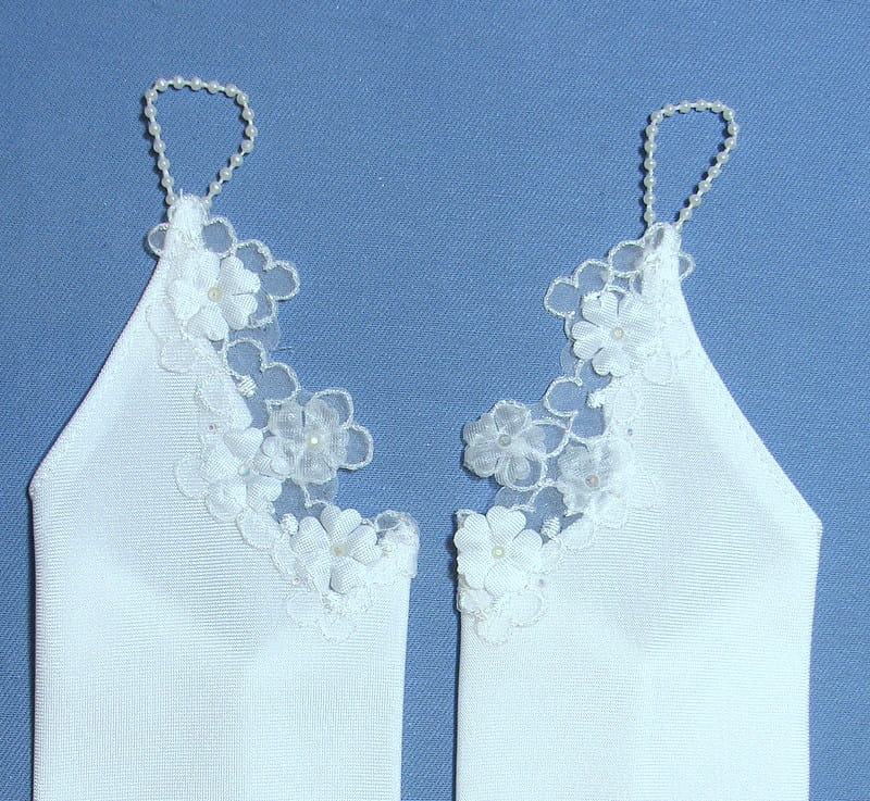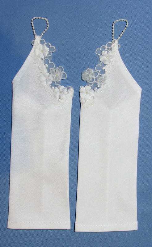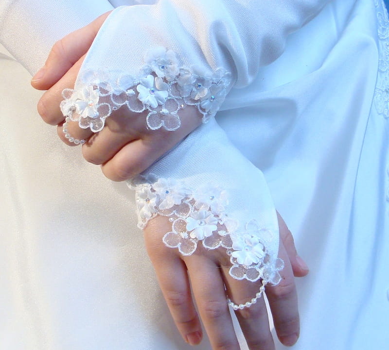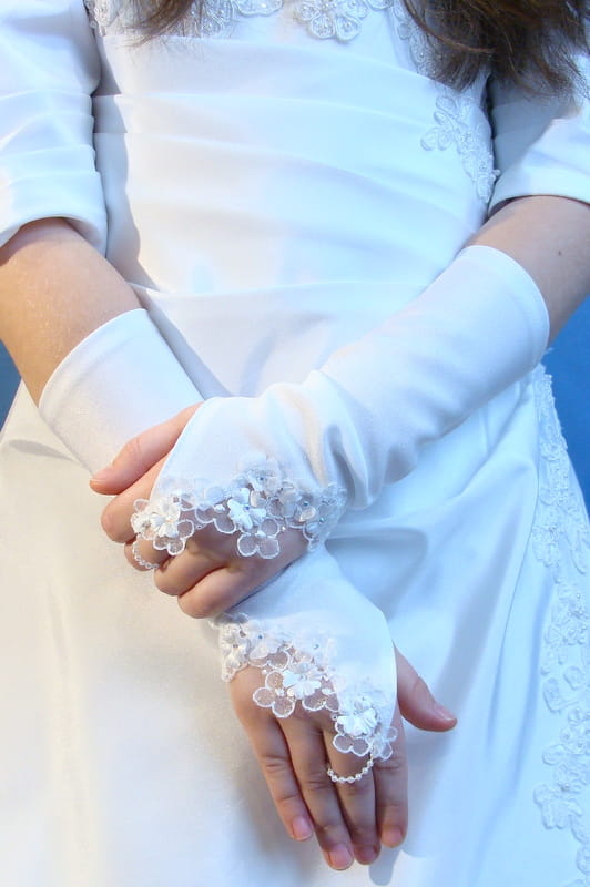 Piękna, długa rękawiczka komunijna dla dziewczynki. Mocowana na środkowy palec za pomocą taśmy z perełkami.Rękawiczka zdobiona aplikacjami z mieniącymi się cyrkoniami.