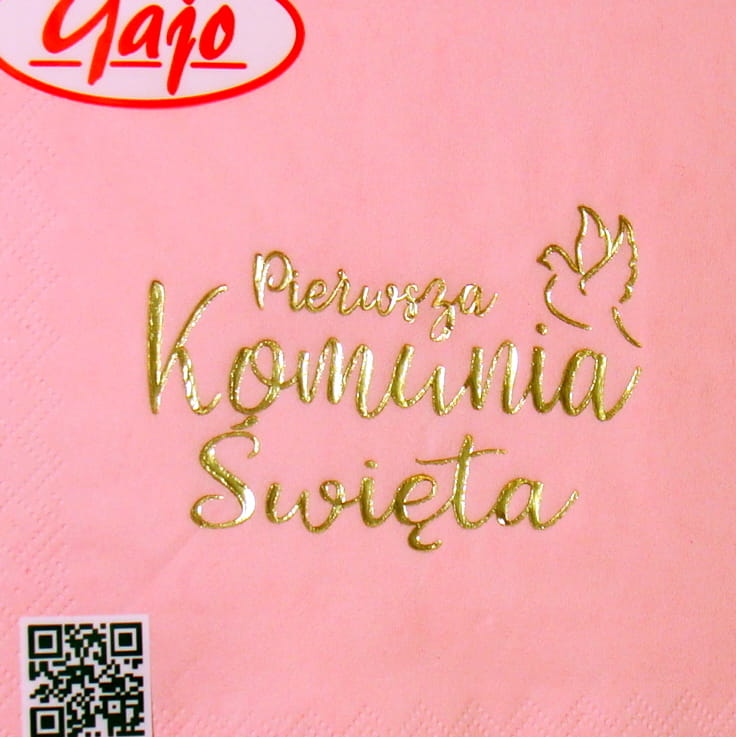 Serwetki komunijne Gajo - złoty motyw na różowym tle Serwetki komunijne Gajo , trójwarstwowe, w kolorze różowym ze złotym nadrukiem, wymiary 33x33 centymetry. 1 opakowanie zawiera 20 sztuk.
