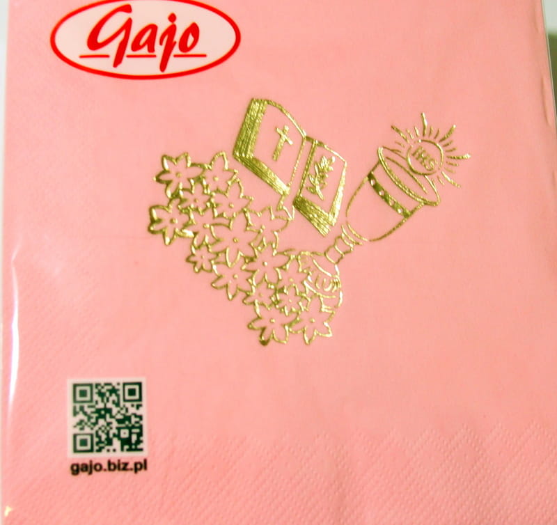 Serwetki komunijne Gajo - złoty motyw na różowym tle Serwetki komunijne Gajo , trójwarstwowe, w kolorze różowym ze złotym nadrukiem, wymiary 33x33 centymetry. 1 opakowanie zawiera 20 sztuk.