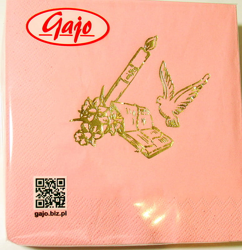 Serwetki komunijne Gajo - złoty motyw na różowym tle Serwetki komunijne Gajo , trójwarstwowe, w kolorze różowym ze złotym nadrukiem, wymiary 33x33 centymetry. 1 opakowanie zawiera 20 sztuk.