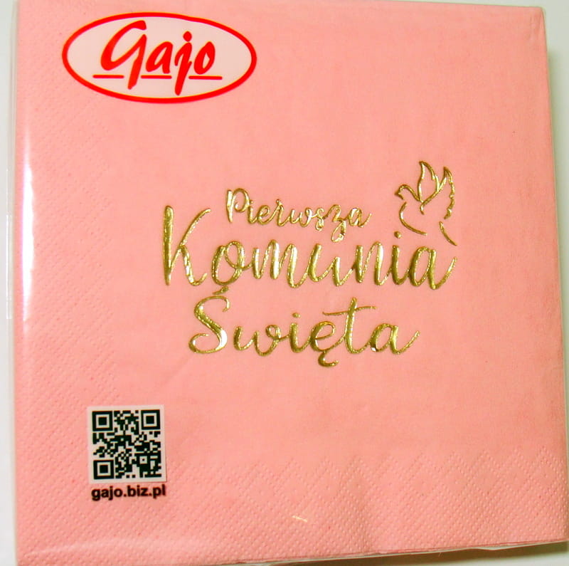 Serwetki komunijne Gajo - złoty motyw na różowym tle Serwetki komunijne Gajo , trójwarstwowe, w kolorze różowym ze złotym nadrukiem, wymiary 33x33 centymetry. 1 opakowanie zawiera 20 sztuk.