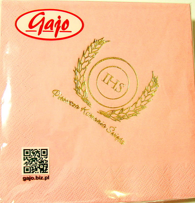 Serwetki komunijne Gajo - złoty motyw na różowym tle Serwetki komunijne Gajo , trójwarstwowe, w kolorze różowym ze złotym nadrukiem, wymiary 33x33 centymetry. 1 opakowanie zawiera 20 sztuk.