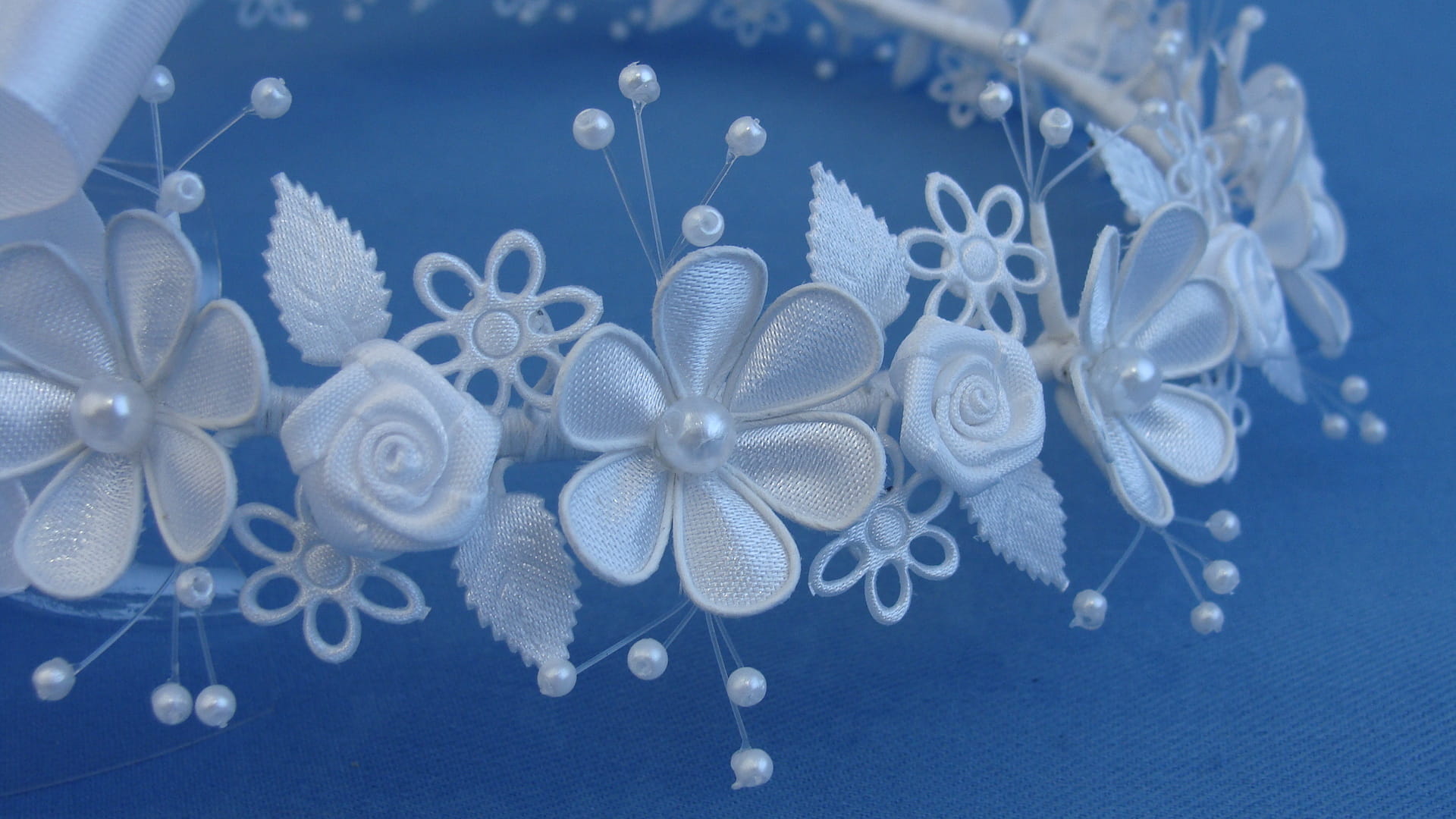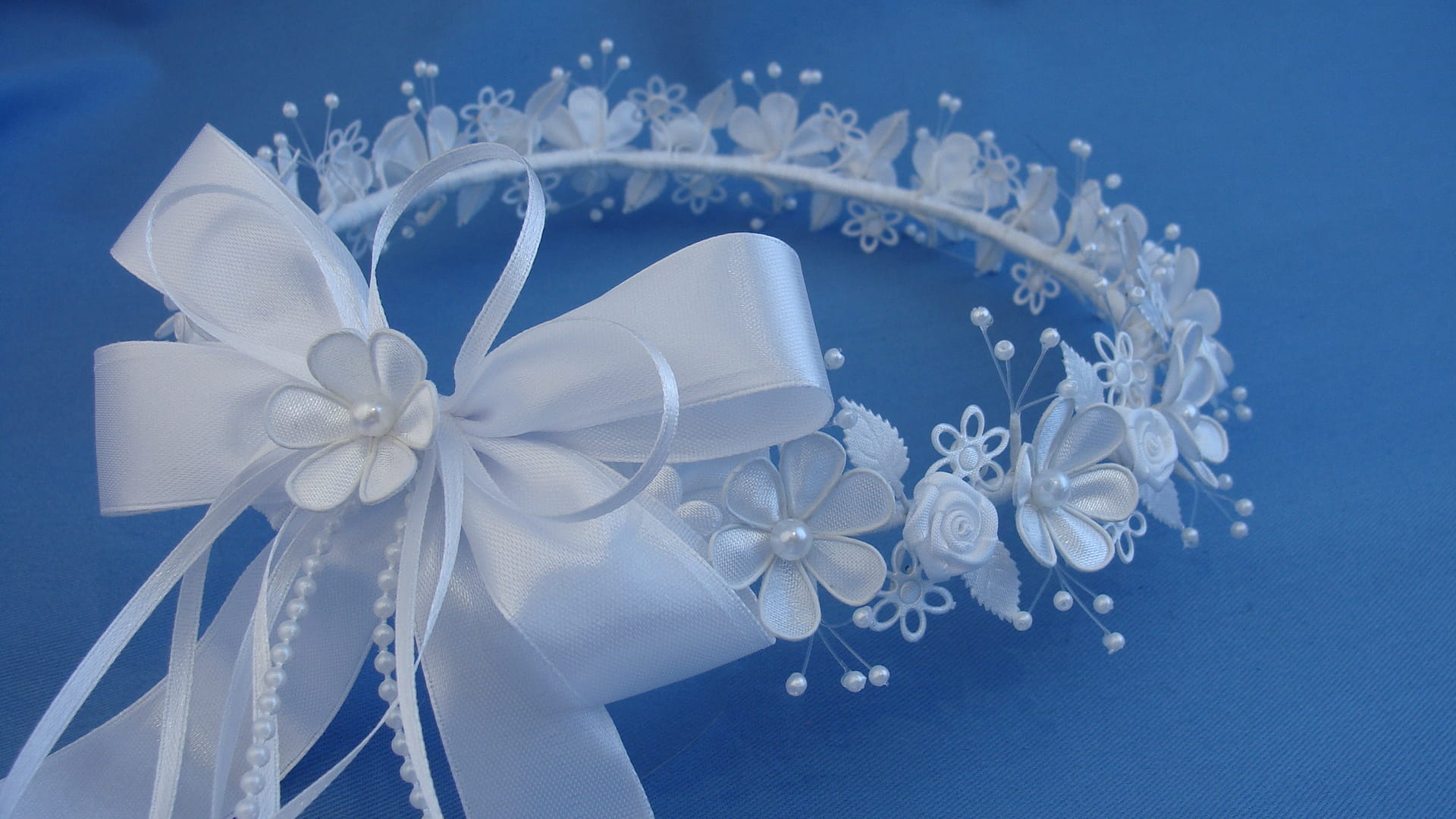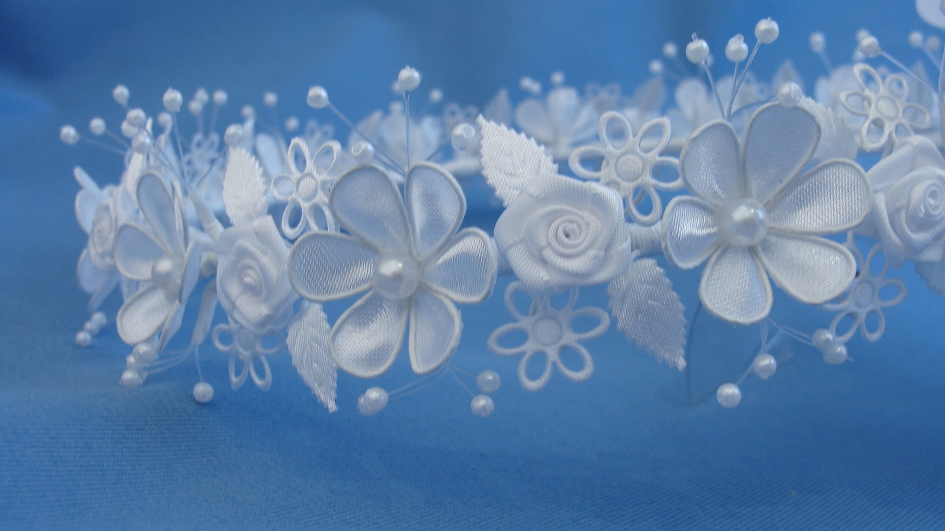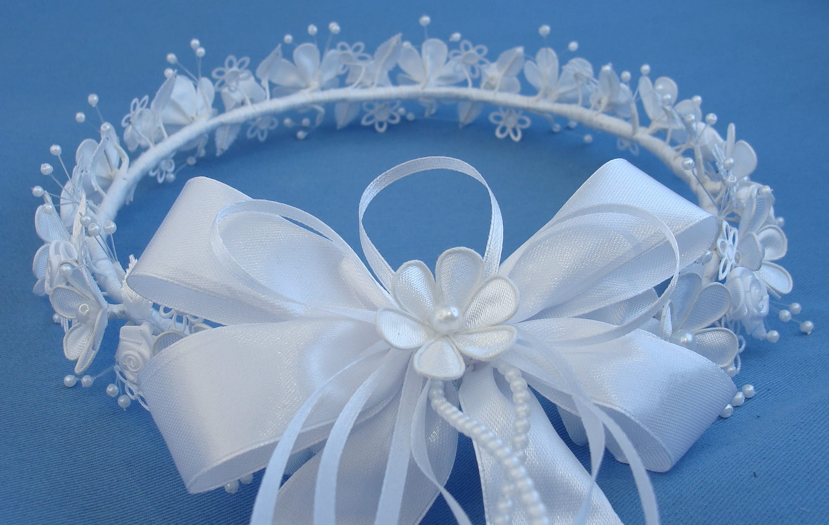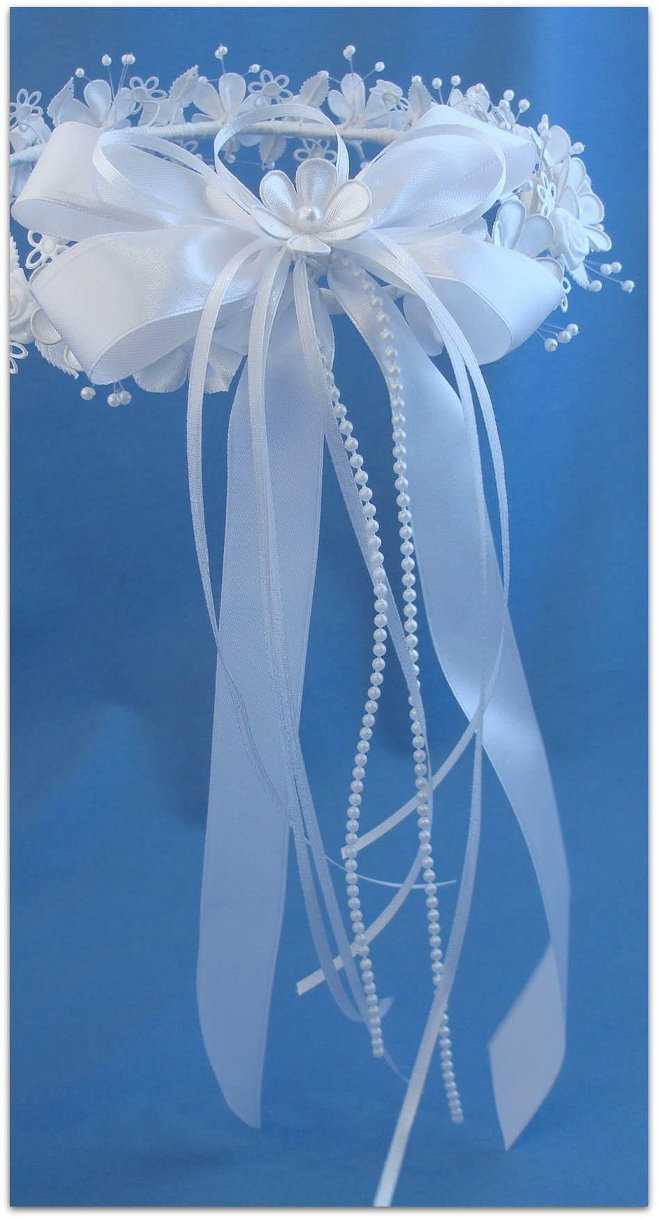 Delikatny wianek komunijny wykonany z atłasowych płatków, małych różyczek, nanizanych na pręciki perełek, "dziurawych" kwiatków oraz listkami. Wianek delikatny i skromny.