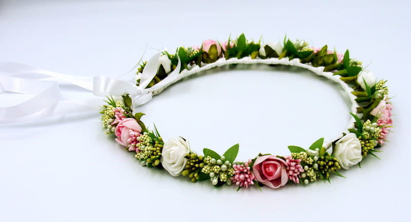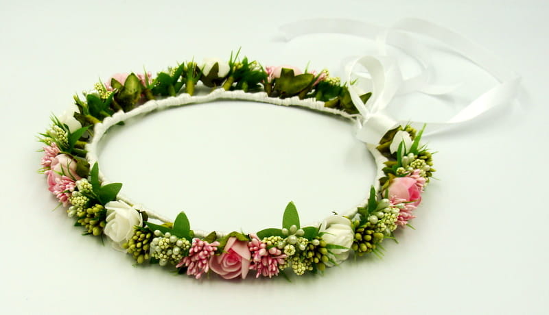 Wianek spleciony z różowych i białych różyczek piankowych, ozdobiony różowymi i zielonymi szyszeczkami. Obwód wianka jest regulowany.