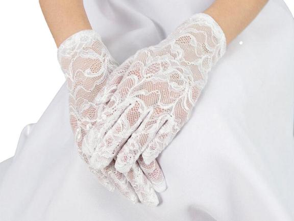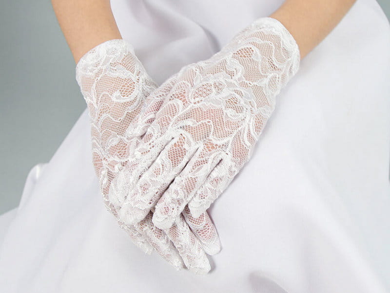 # Rękawiczki komunijne KB50mini Delikatna rękawiczka zakrywająca wszystkie palce , wykonana z elastycznego materiału,ozdobiona piękną, gipiurową aplikacją. Cena podana za parę.