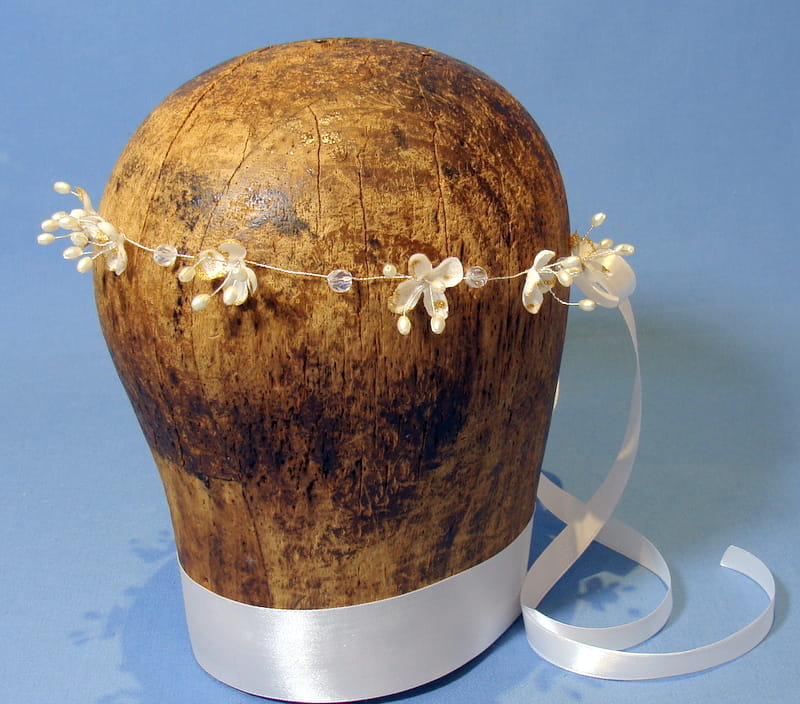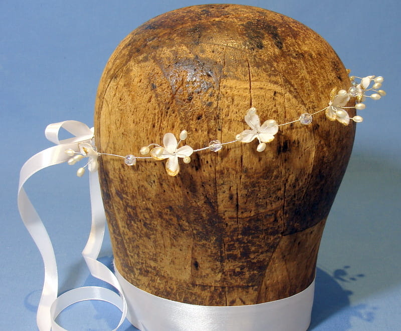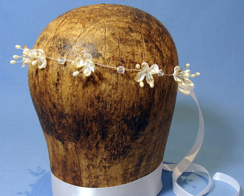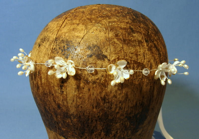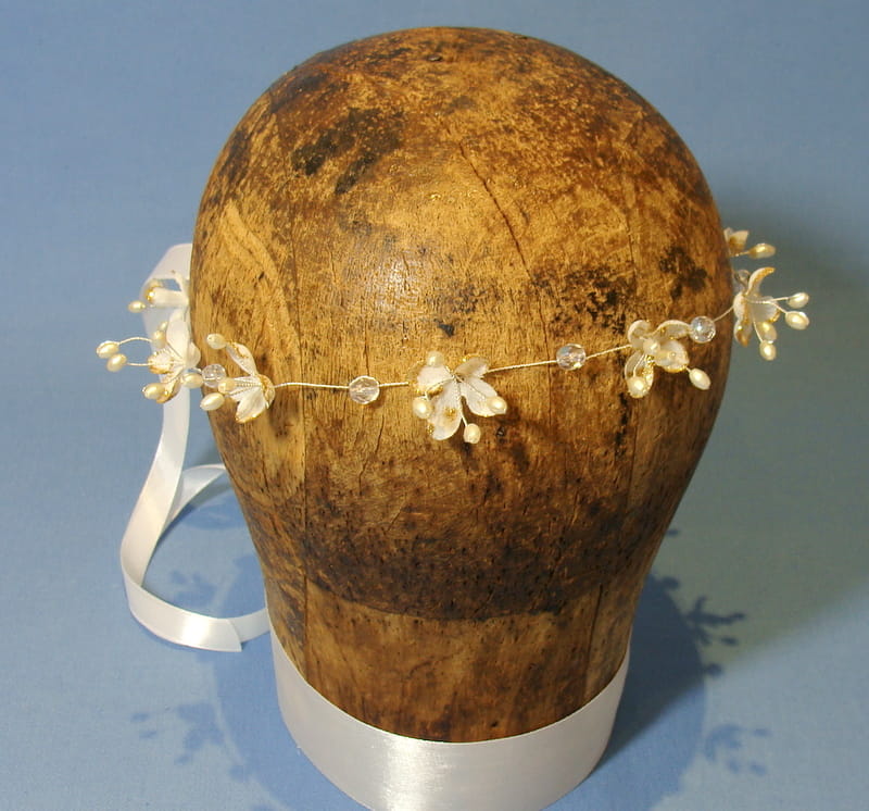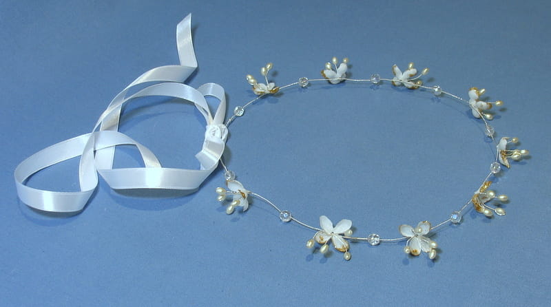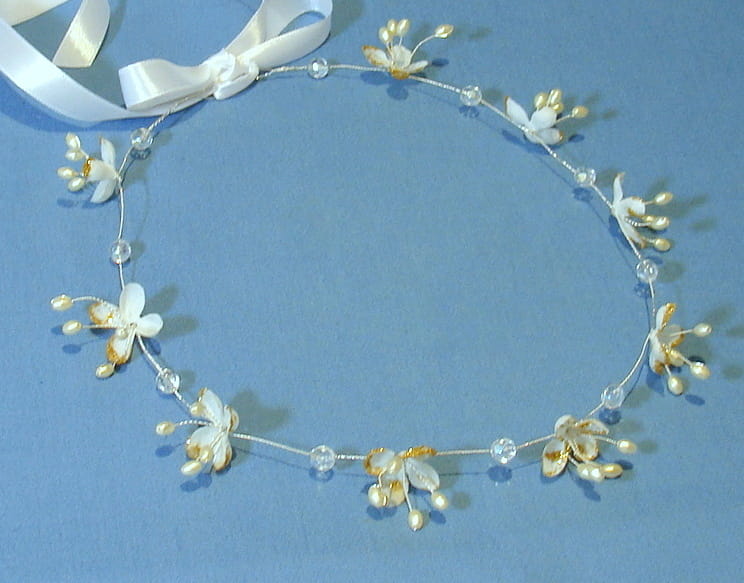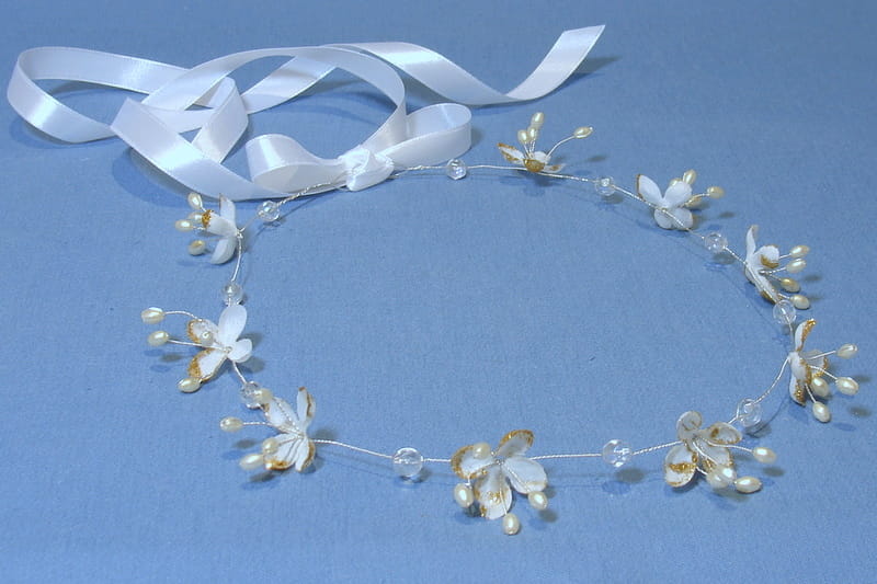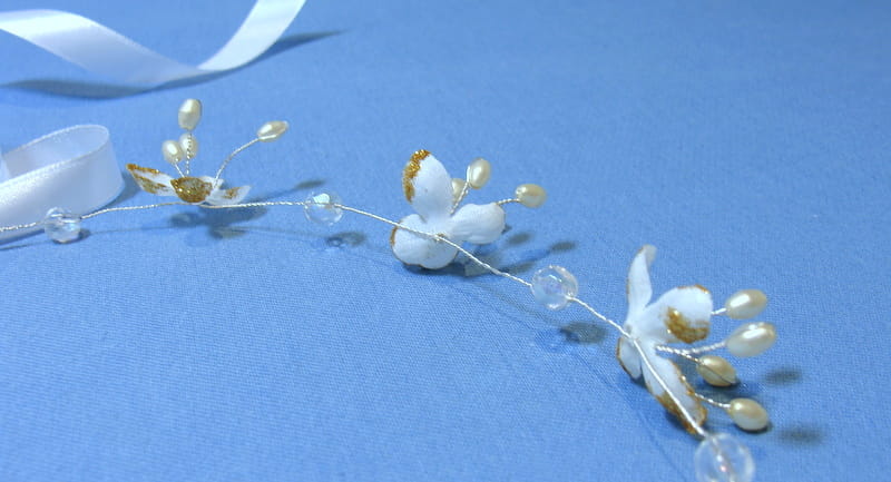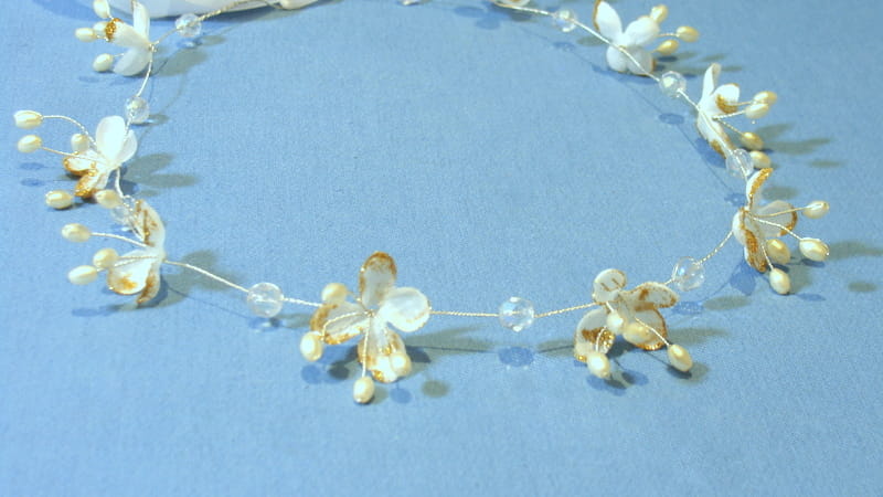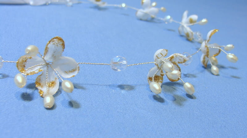 Wianek zdobiony jest białymi kwiatkami bzu , które mają złotą, brokatową posypkę.Kwiatki te doskonale imitują żywe rośliny. Dodatkowo wianek ozdobiono kryształami i złotymi perełkami na srebrnym druciku.