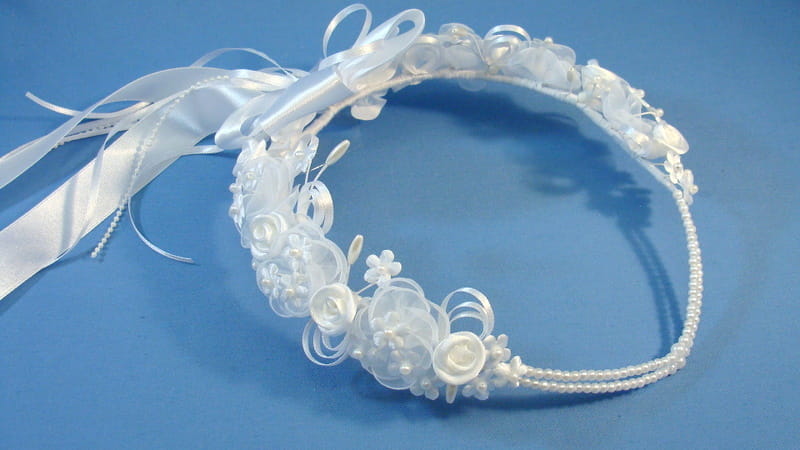 Sisi jest bardzo delikatnym wiankiem. Na przodzie ma dwa rzędy perełek, boki to kompozycja atłasowych różyczek, kwiatków , organdynowych okółków, pawich oczek , perełek i łezek,