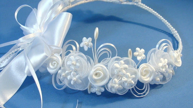 Tył wianka ozdabia biała , atłasowa kokarda , atłasowe tasiemki, perełki nanizane na sznureczek i komponująca się z całym wiankiem różyczka.
