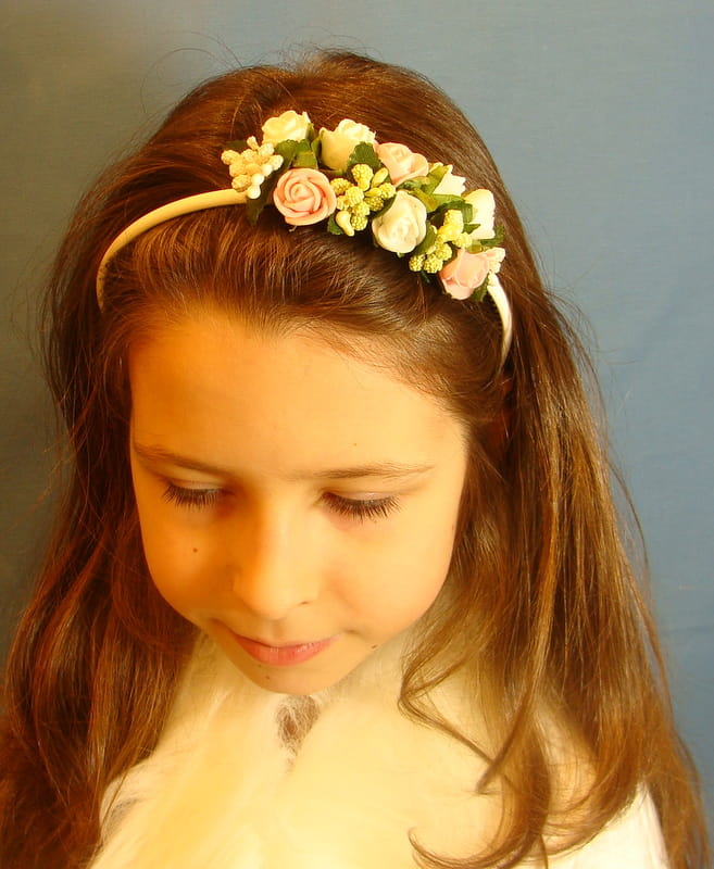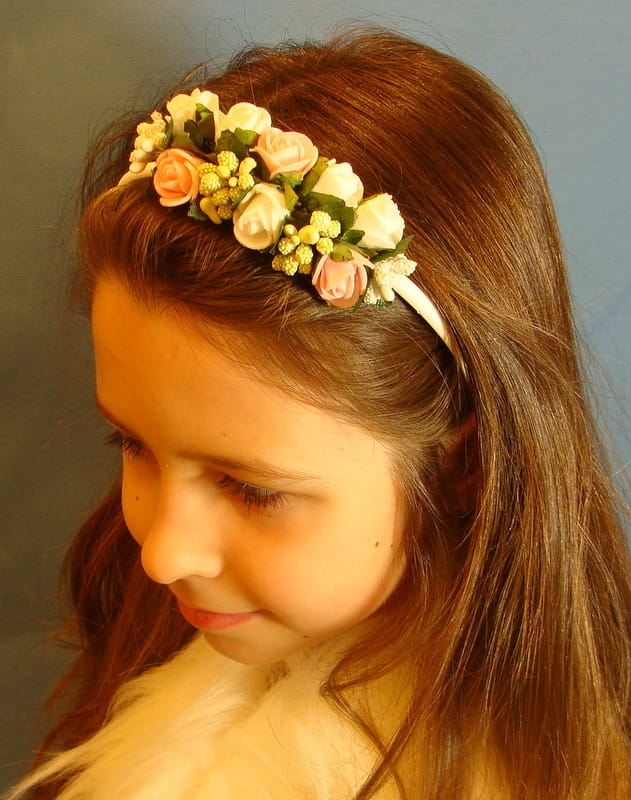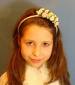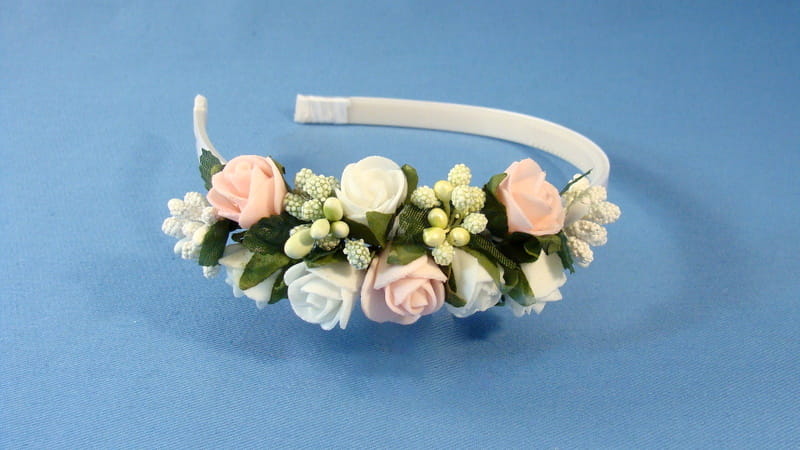 Opaska z białych i różowych różyczek piankowych ozdobiona białymi i zielonymi szyszeczkami.