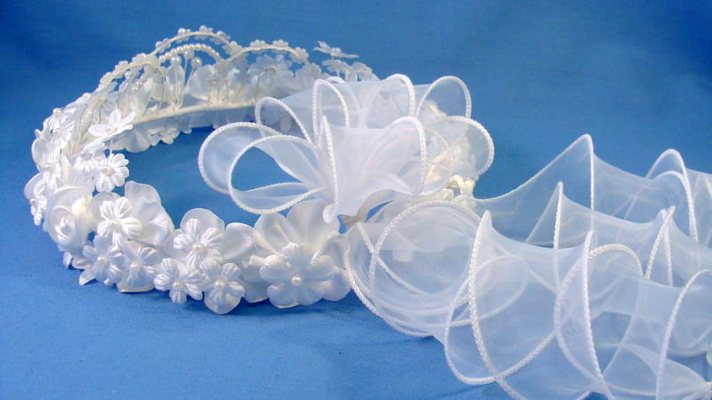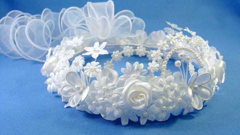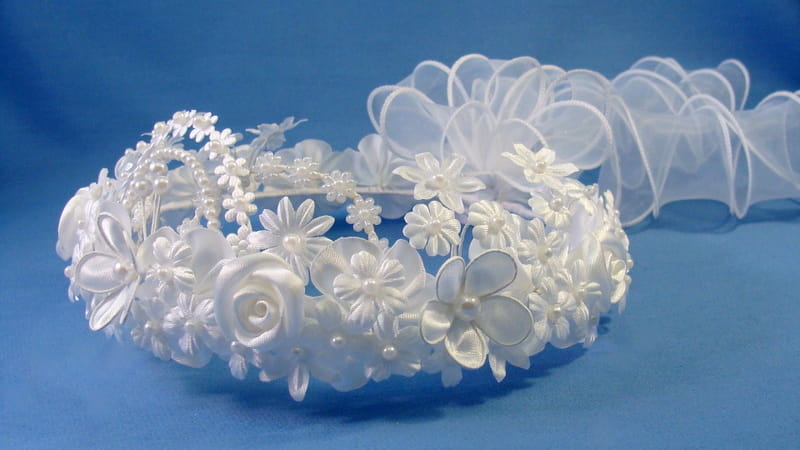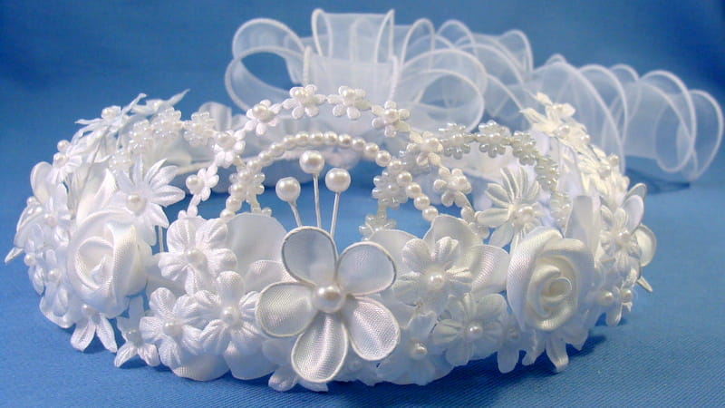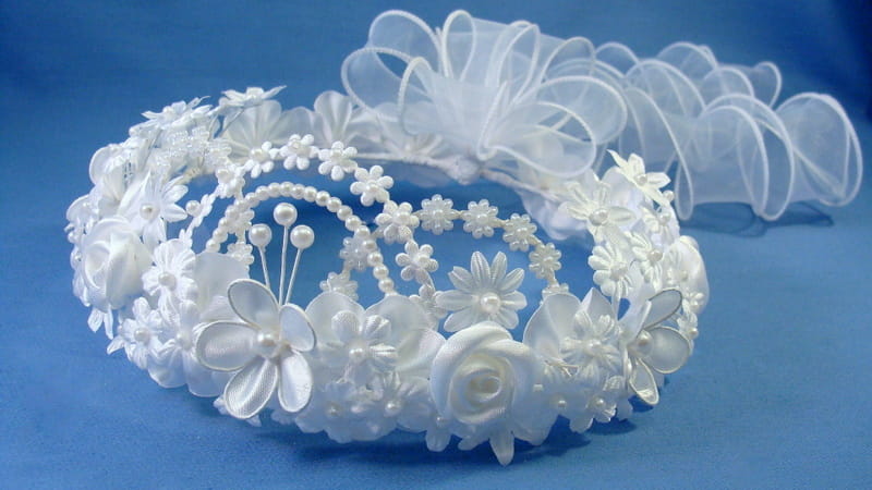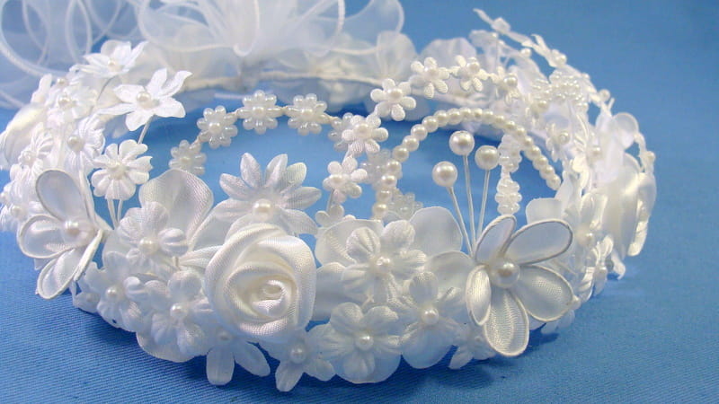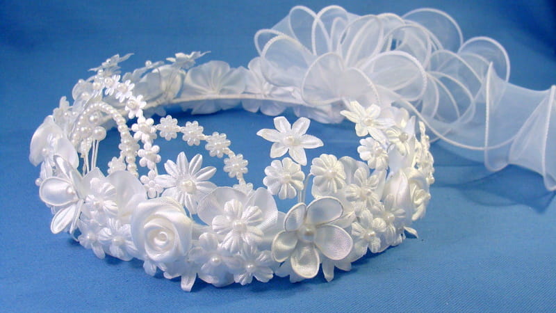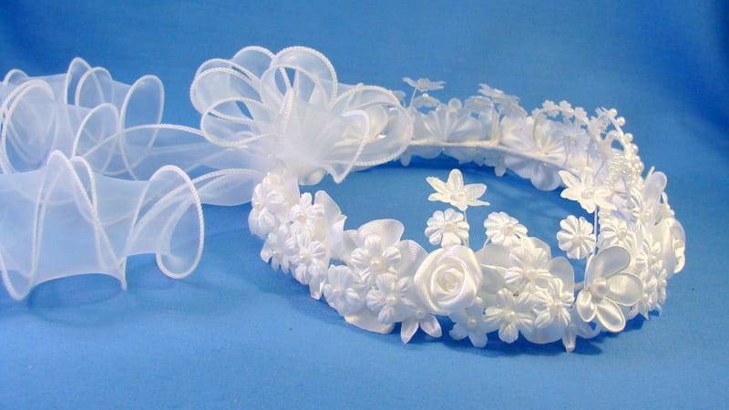 Tekla jest bardzo ładnym, bogatym wiankiem, który na pewno sprawi, iż dziewczynka, który go założy, poczuje się wyjątkowo. Całość składa się z atłasowych ręcznie robionych różyczek oraz atłasowych kwiatków. Przód wianka stanowi koronka wyklejona perełkami, która przystrojona jest po bokach taśmami z masy perłowej. Wszystkie elementy są niezwykle delikatne dzięki czemu wianek mimo bogatej formy nie traci elegancji .