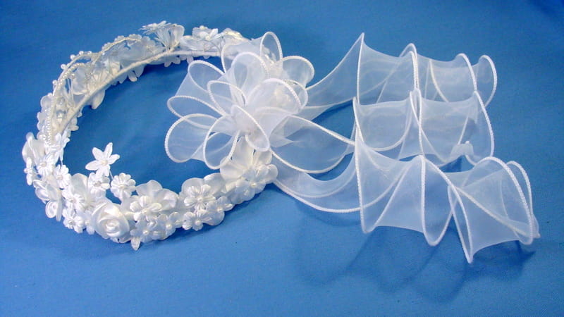 Tył wianka stanowi organdynowa kokarda z 3 lokami.